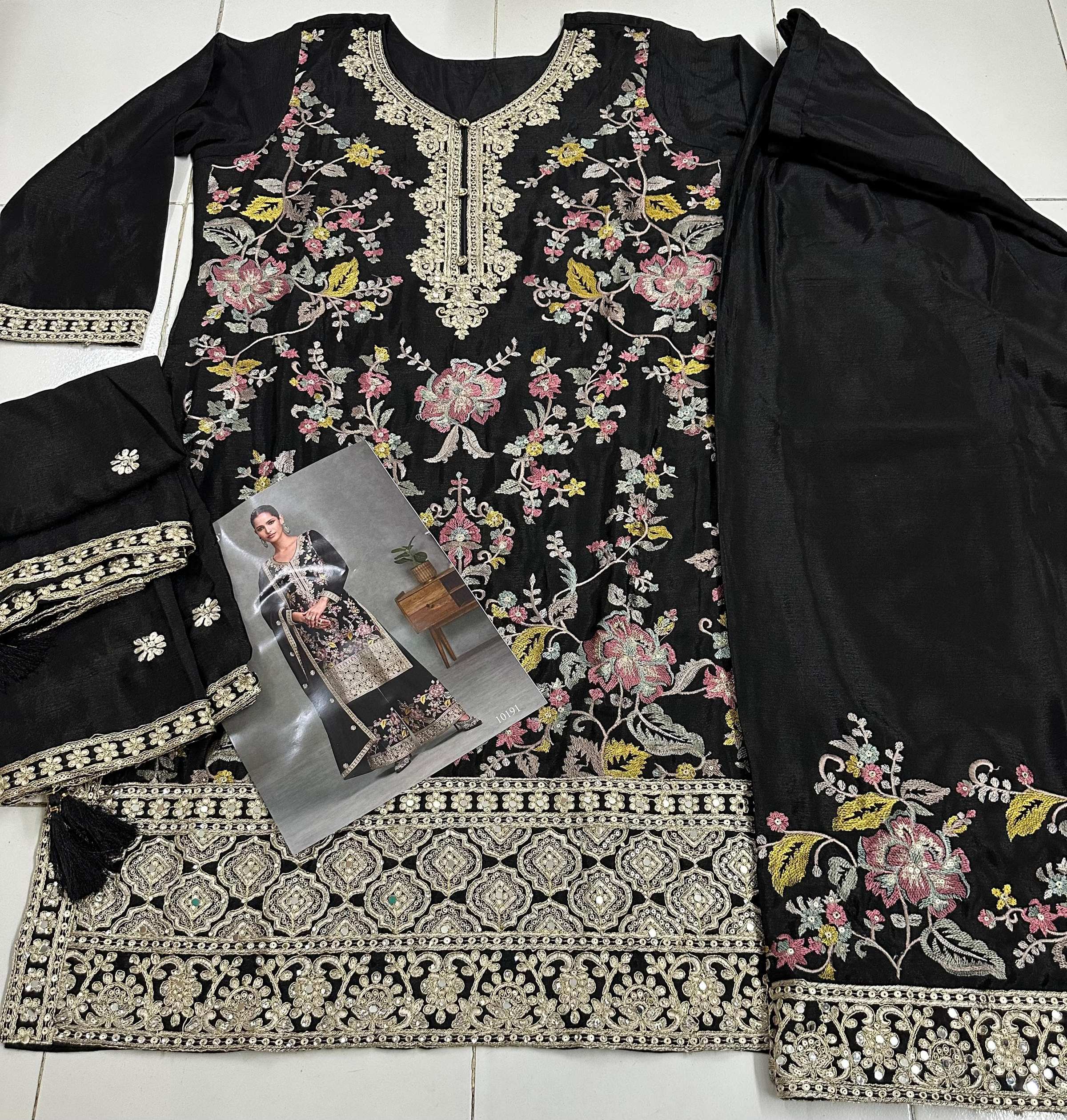 Aarshi Fashions Black Chinon Heavy Embroidery Wedding Palazzo Suit