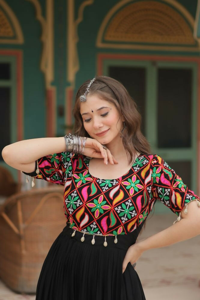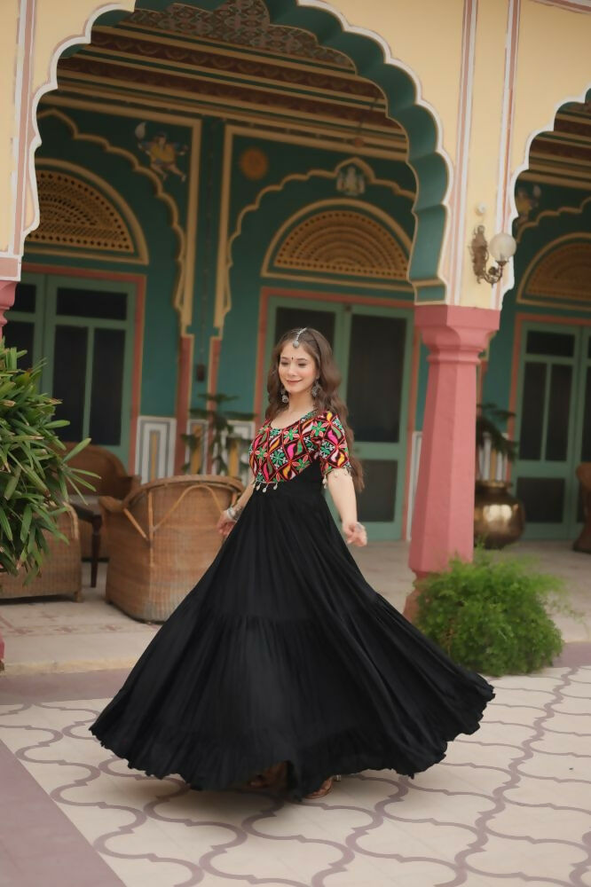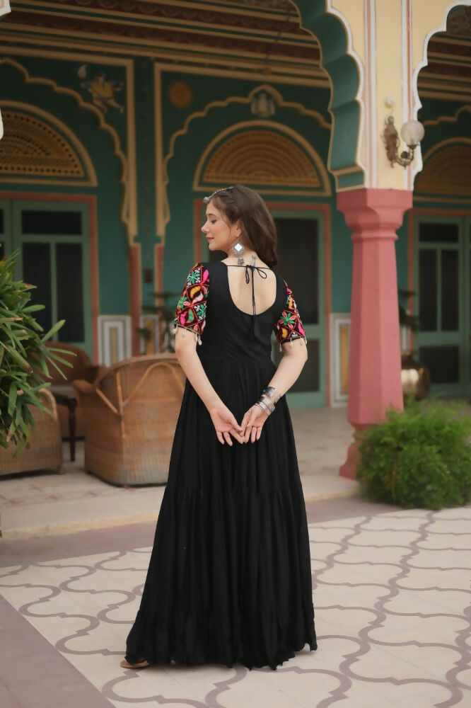 Aastha Fashion Black 14 kg Reyon Kutchi Gamthi Kodi Work Party Wear Designer Gown