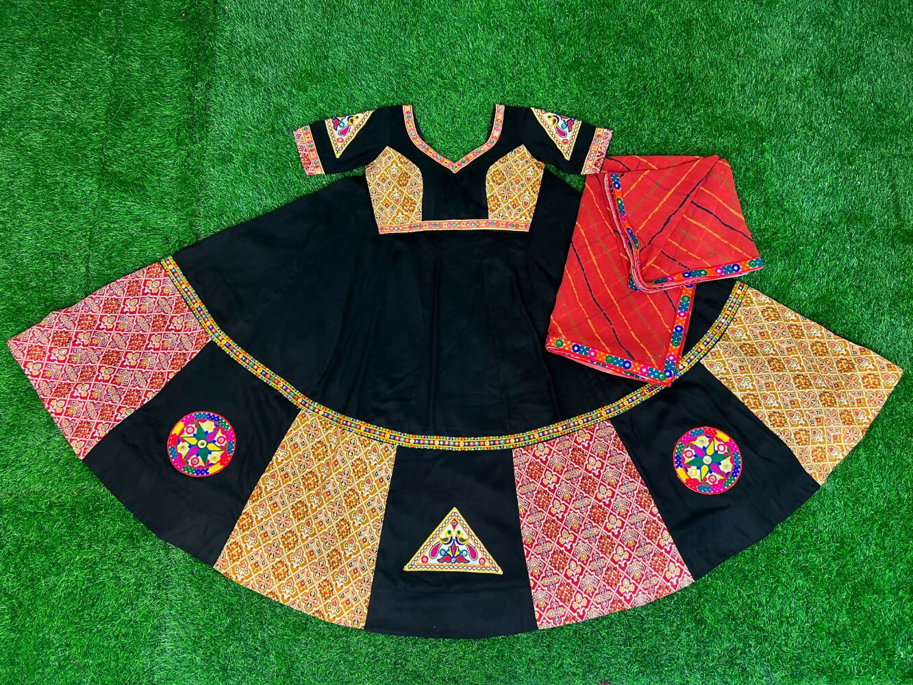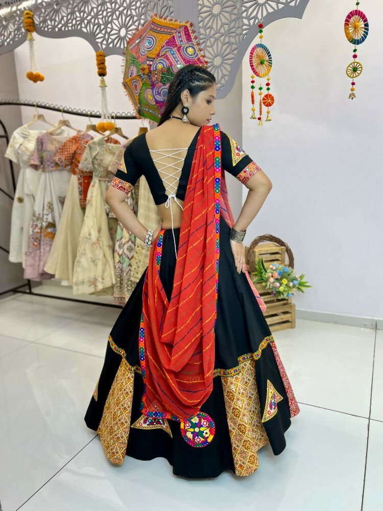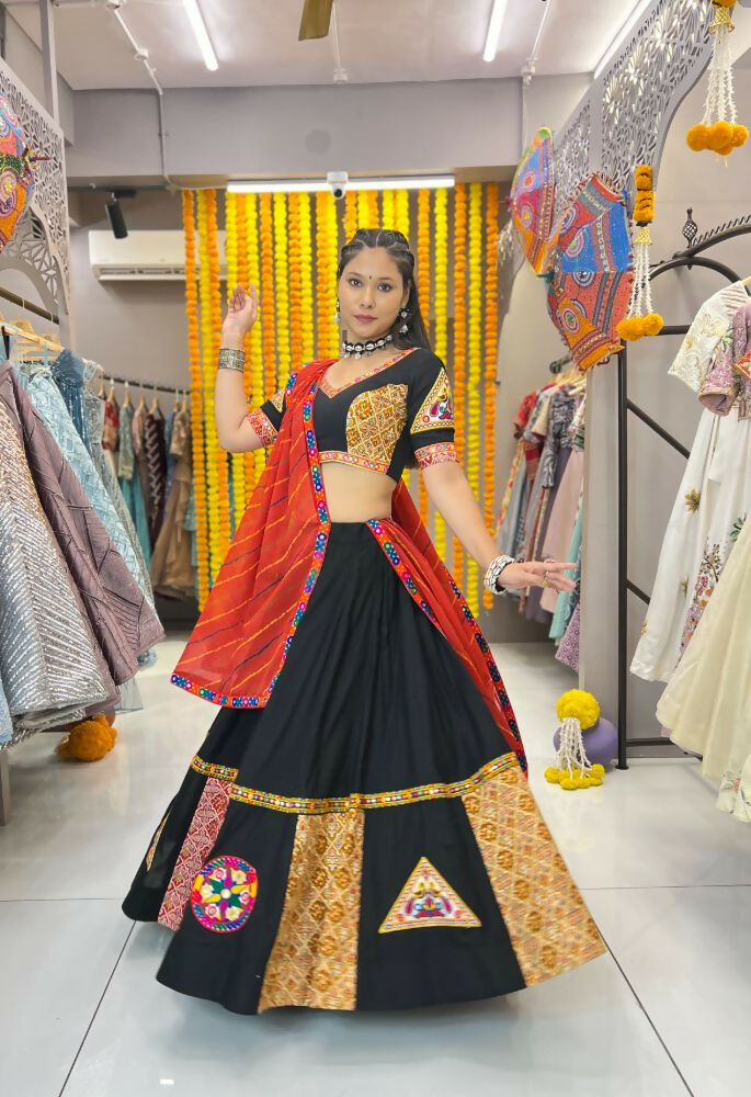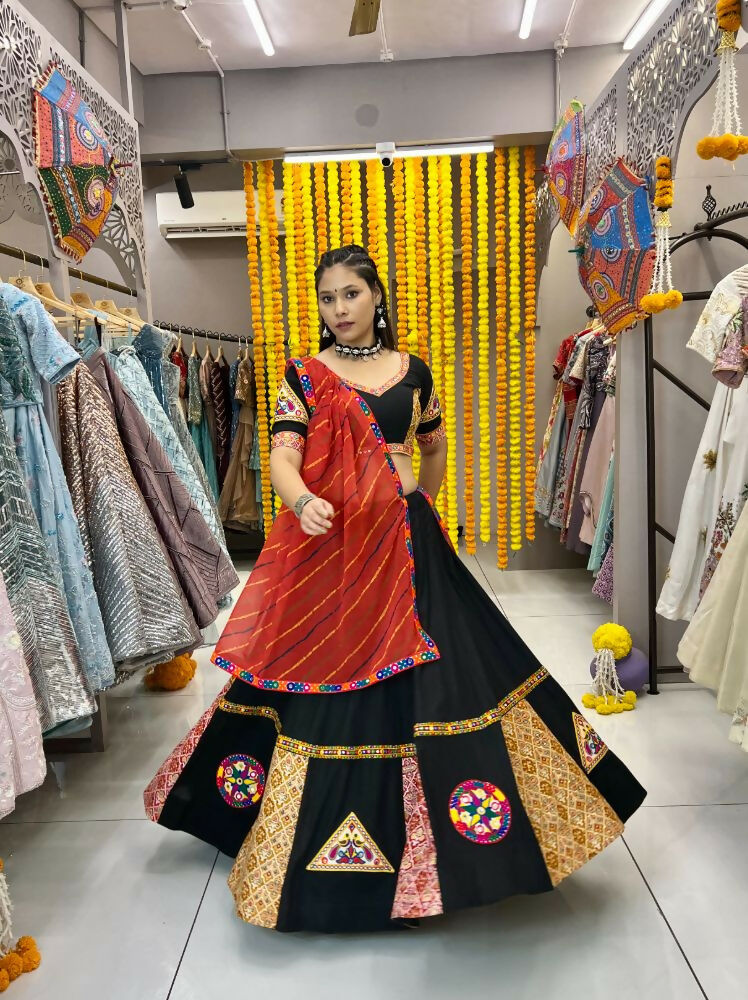 Aastha Fashion Black Rayon Gamthi Work Real Mirror Patch + Embroidery Thread Work Lace + Digital Print Semi Stitched Wedding Wear Lehenga Choli