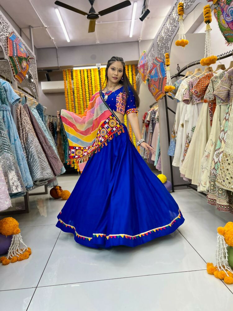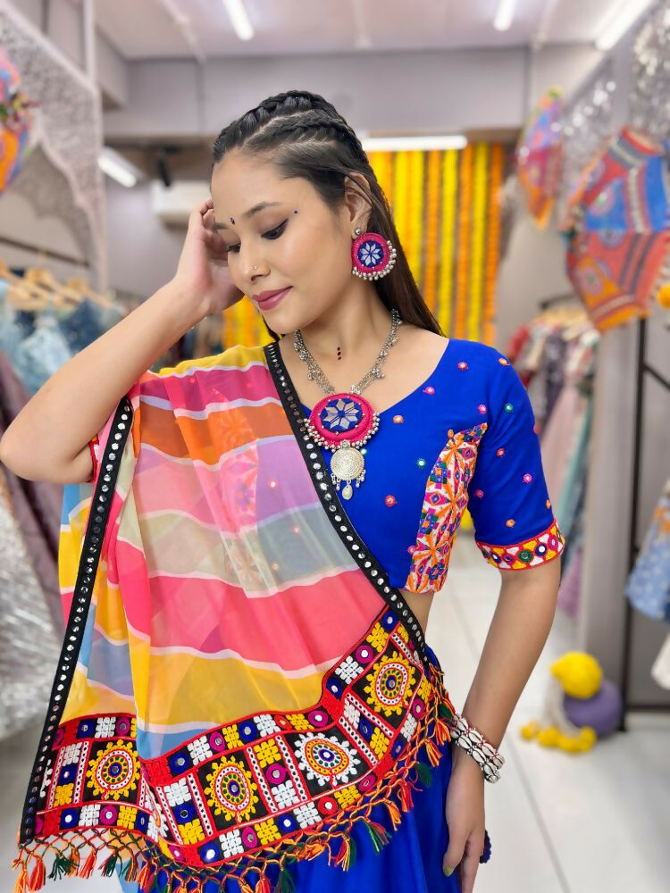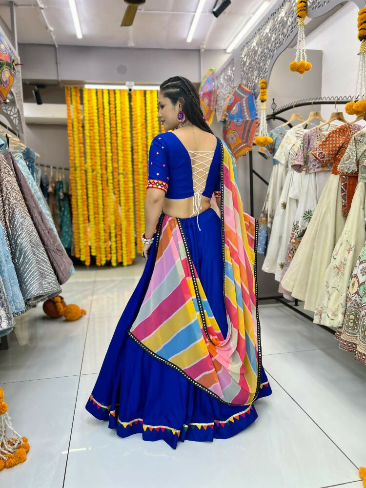 Aastha Fashion Blue Rayon Multi Colour Samosa Lace Semi Stitched Wedding Wear Lehenga Choli