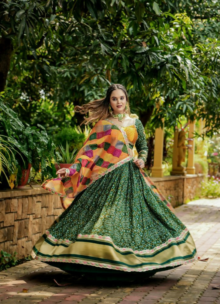 Aastha Fashion Green Gaji Soft Silk Discharge Print + Embroidery Zari / Thread / Sequence Work Lace Semi Stitched Wedding Wear Lehenga Choli