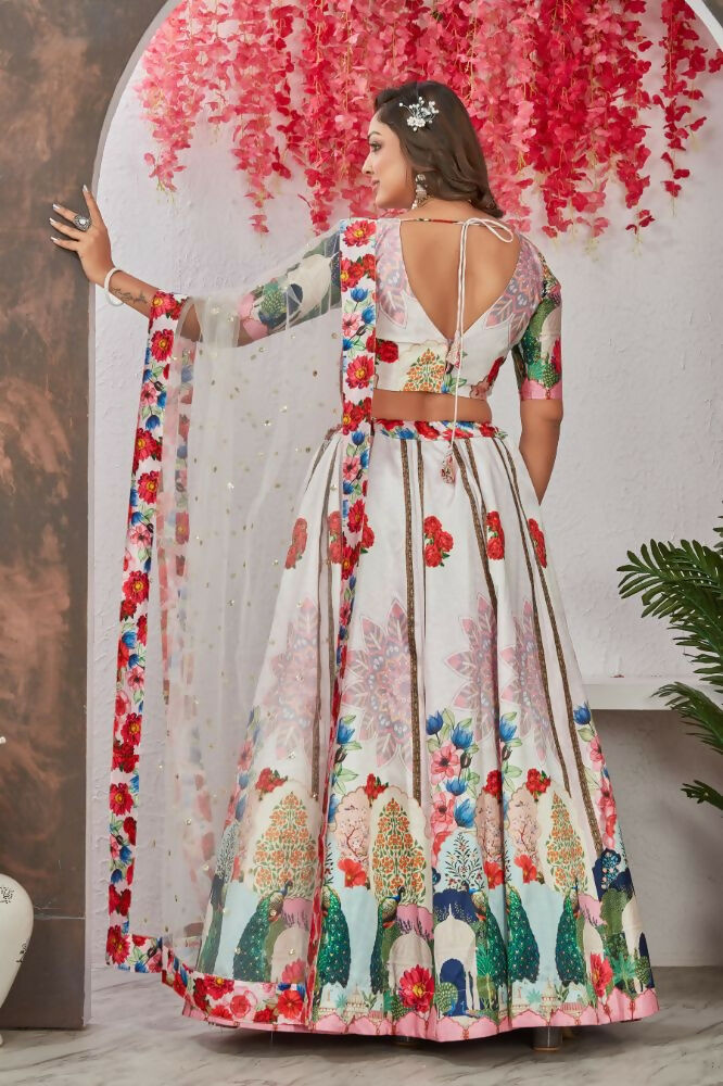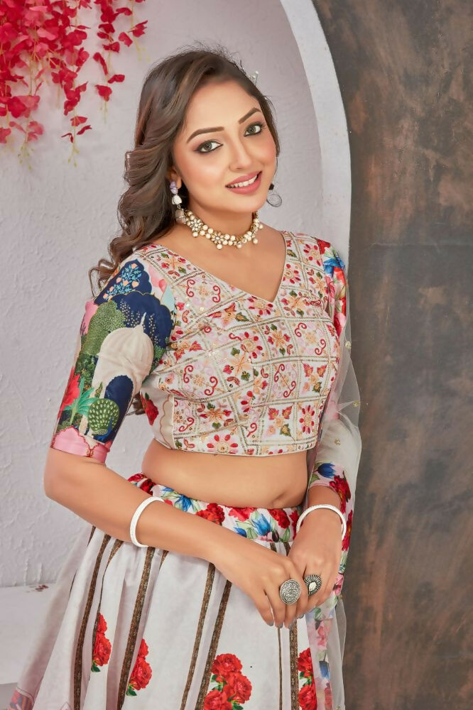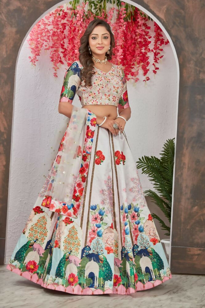 Aastha Fashion Off White Medonna Silk Heavy Digital Print Semi Stitched Wedding Wear Lehenga Choli