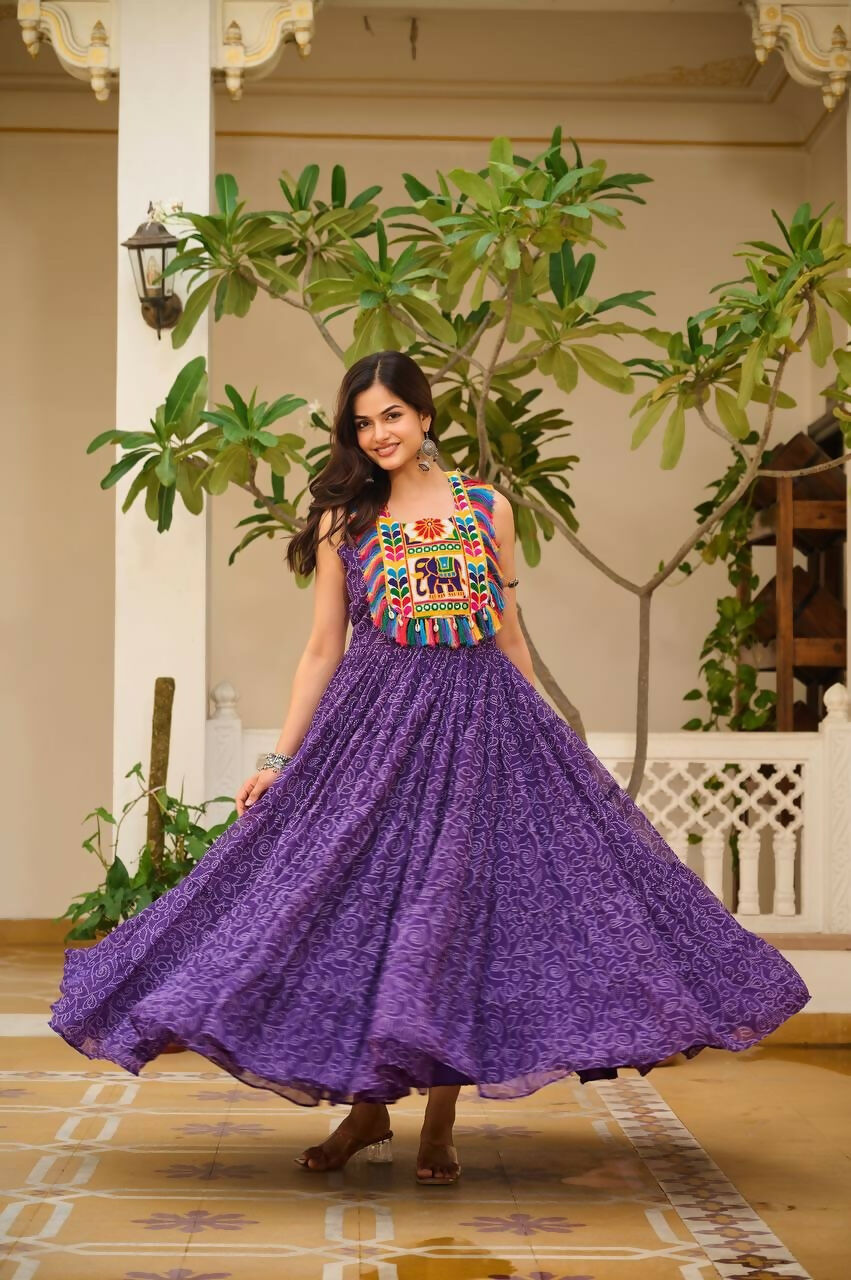 Aastha Fashion Purple Faux Georgette Bandhani Print Navratri Designer Gown Collection