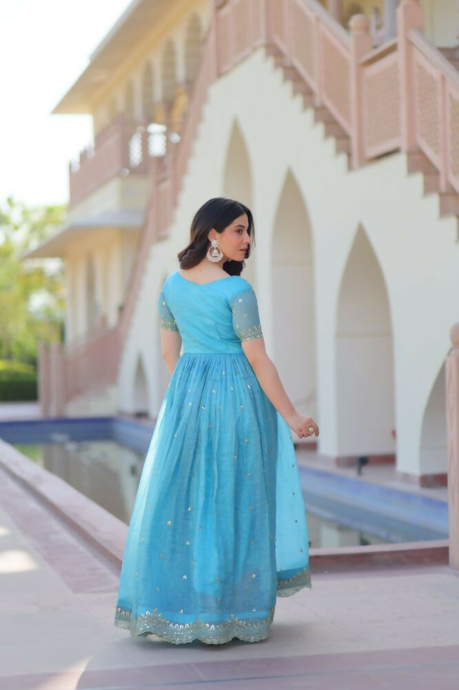 Aastha Fashion Sky Gold Crush Multi Thread Embroidery Zari Sequins-Work Party Wear Designer Gown