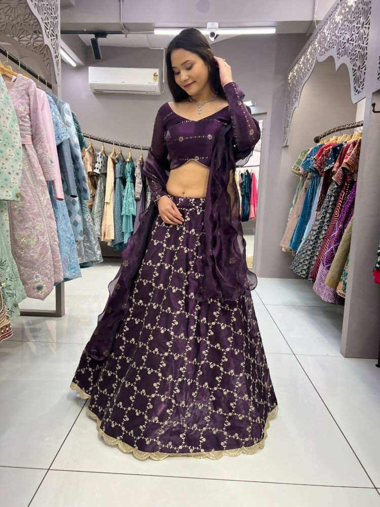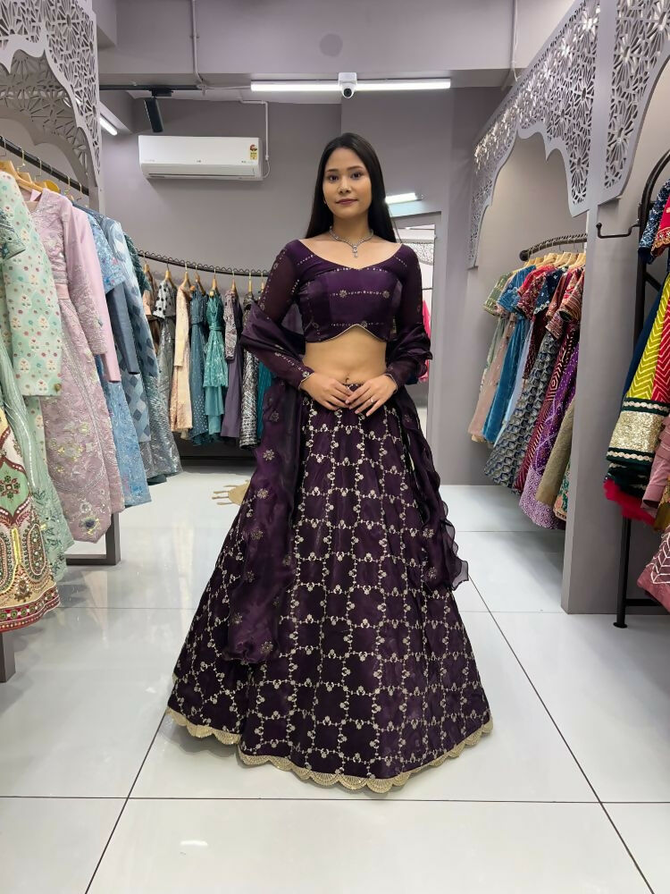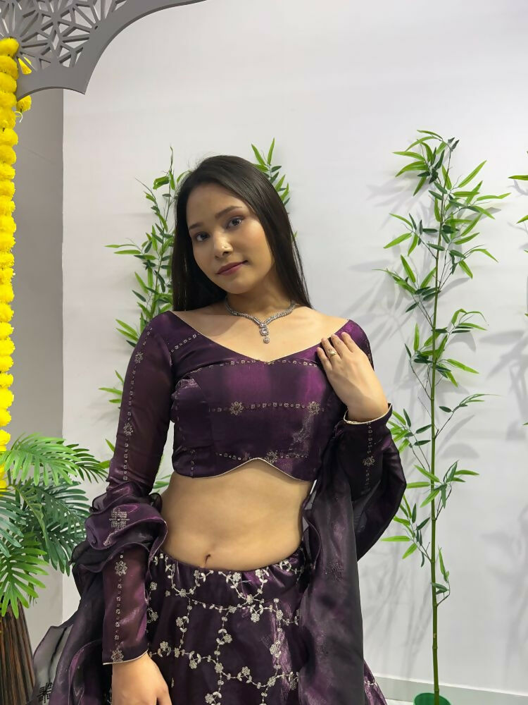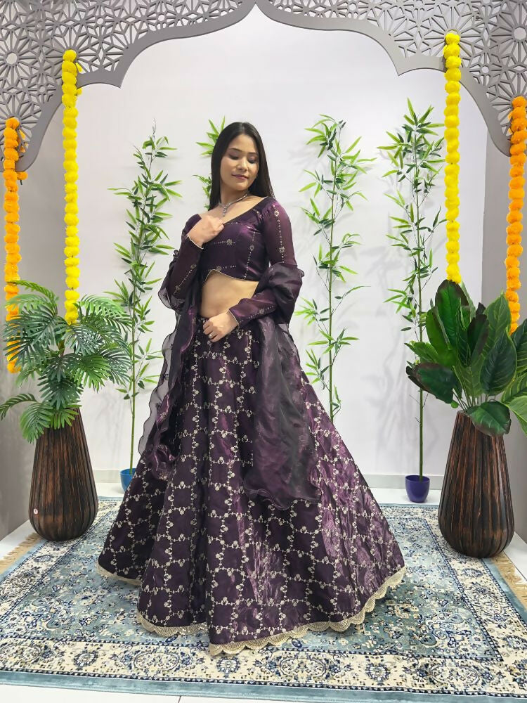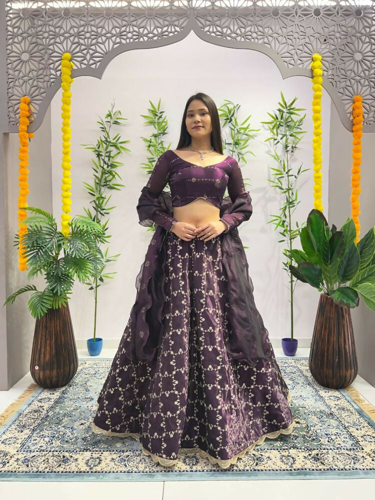 Aastha Fashion Wine Heavy Jimmy Choo Heavy Embroidery Zari +Sequence + Coding Lace Semi Stitched Wedding Wear Lehenga Choli