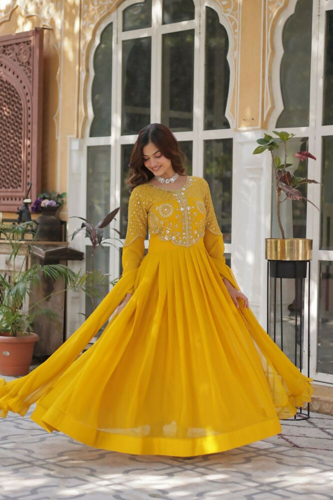 Aastha Fashion Yellow Faux Blooming Embroidery Work Party Wear Designer Gown