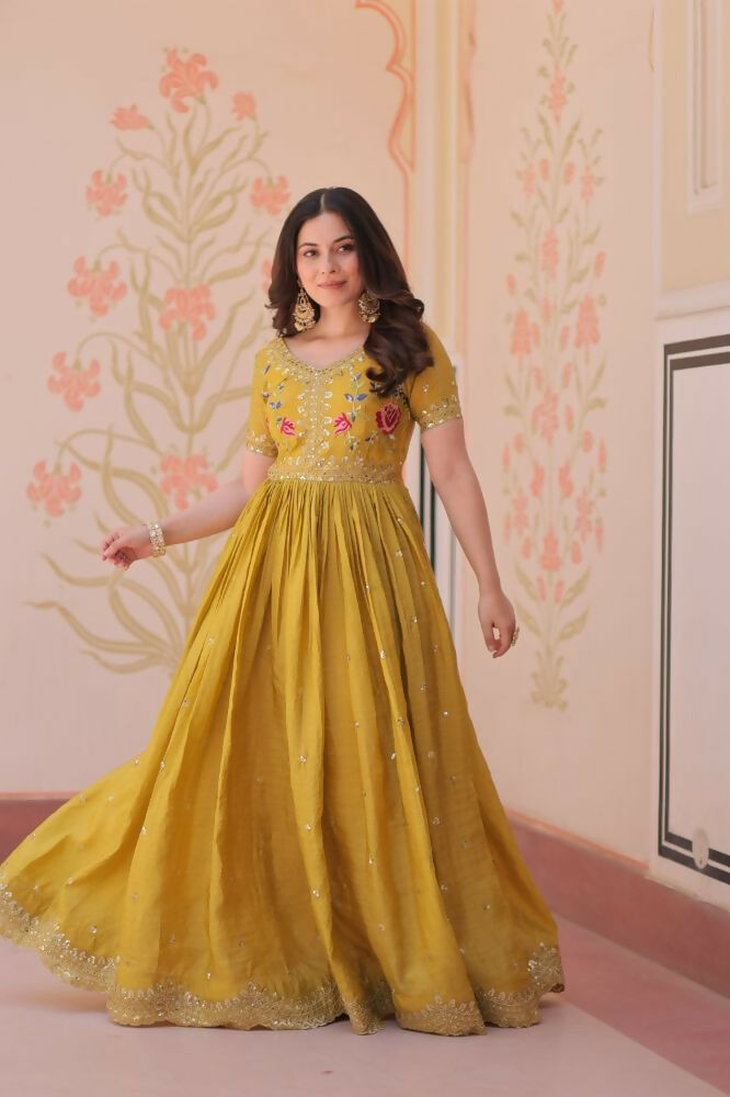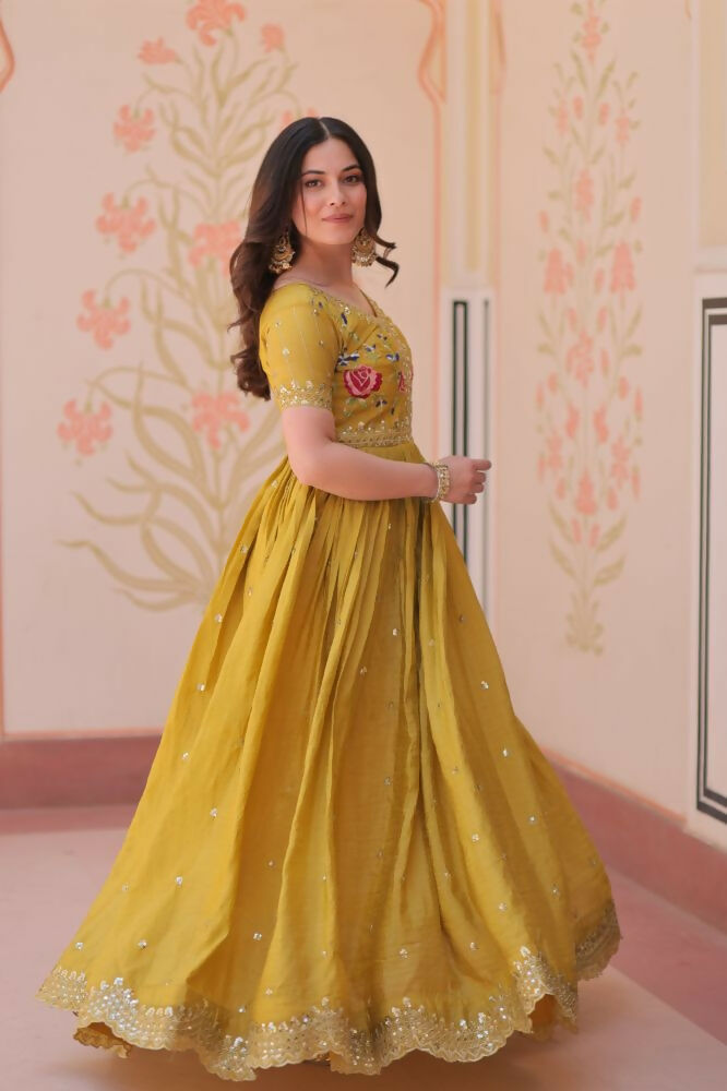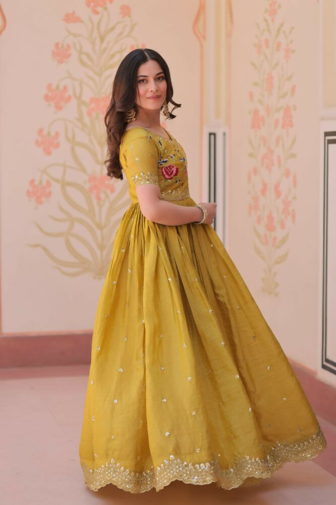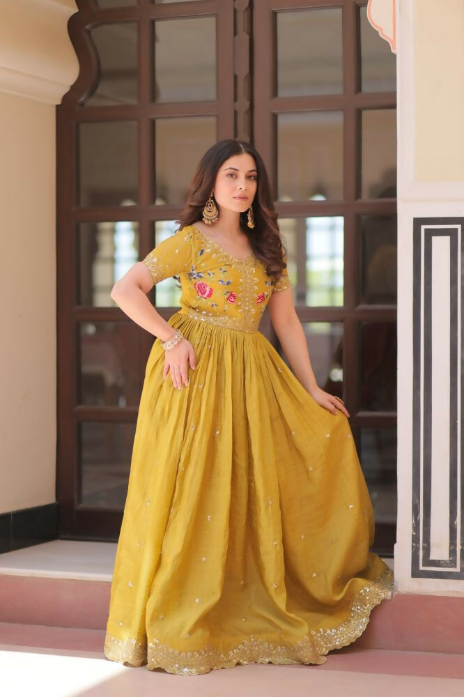 Aastha Fashion Yellow Gold Crush Multi Thread Embroidery Zari Sequins-Work Party Wear Designer Gown