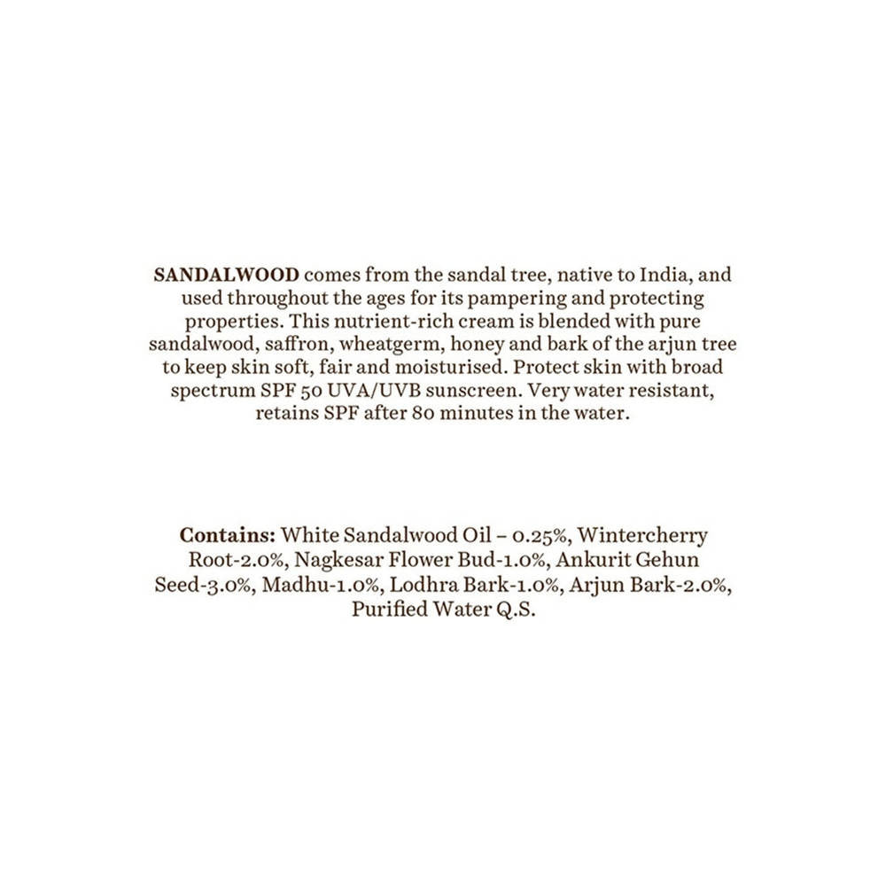 This nutrient-rich cream is blended with pure sandalwood, saffron, wheat germ, honey and bark of the arjun tree to keep skin soft, fair and moisturized. Protects skin with broad spectrum SPF 50 UVA/UVB sunscreen. Very water resistant, retains SPF after 80 minutes in the water.