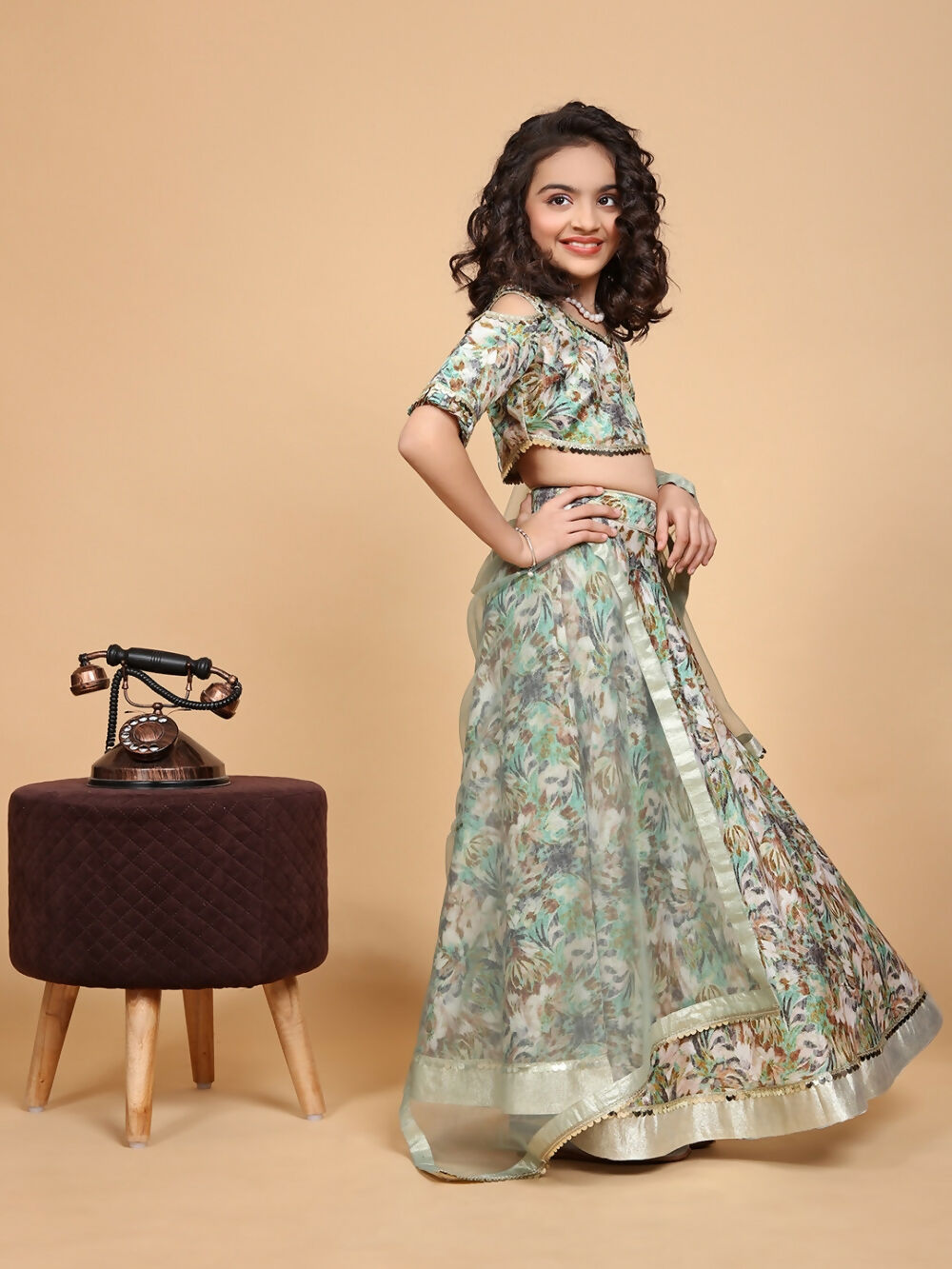 Divine Drape Girls Chinon Green Printed Kids Lehenga Choli With Dupatta