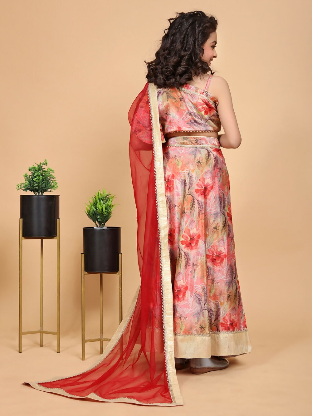 Divine Drape Girls Chinon Peach Printed Kids Lehenga Choli With Dupatta