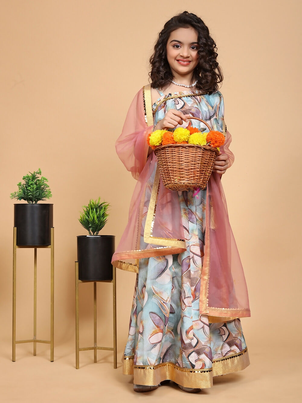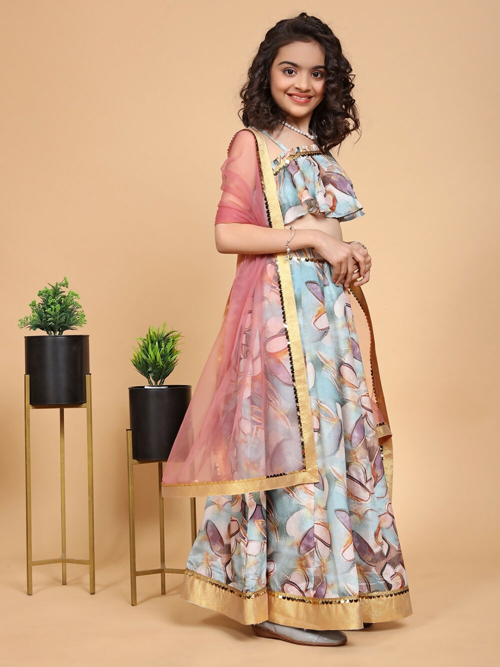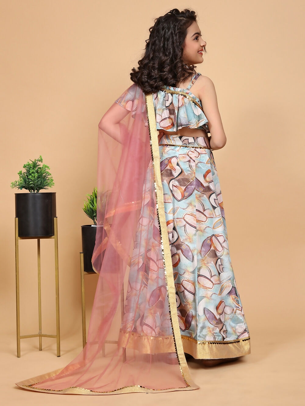 Divine Drape Girls Chinon Sky Blue Printed Kids Lehenga Choli With Dupatta