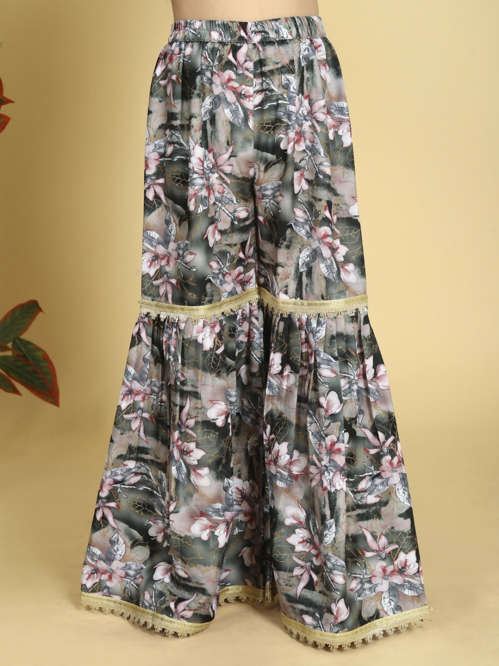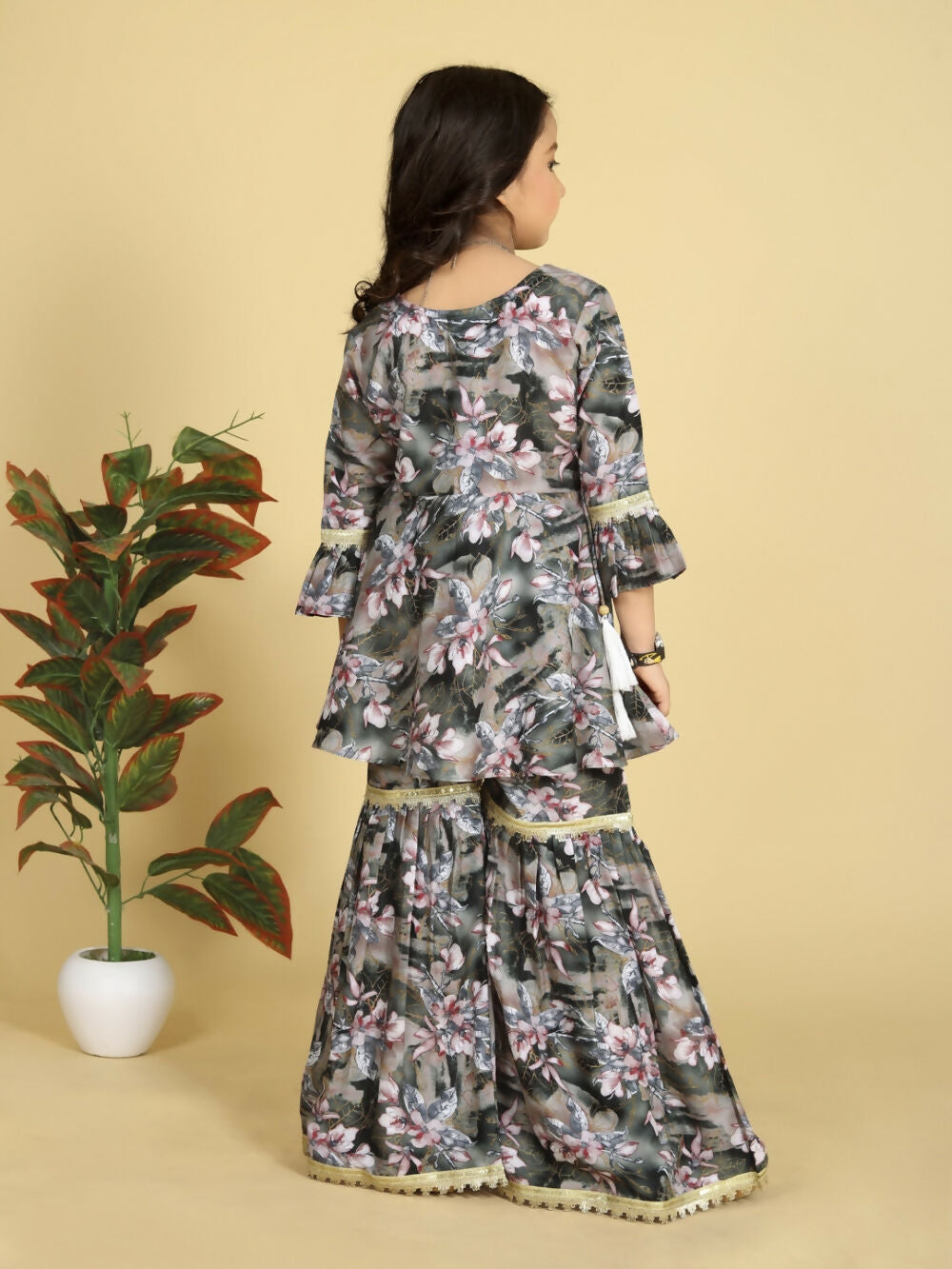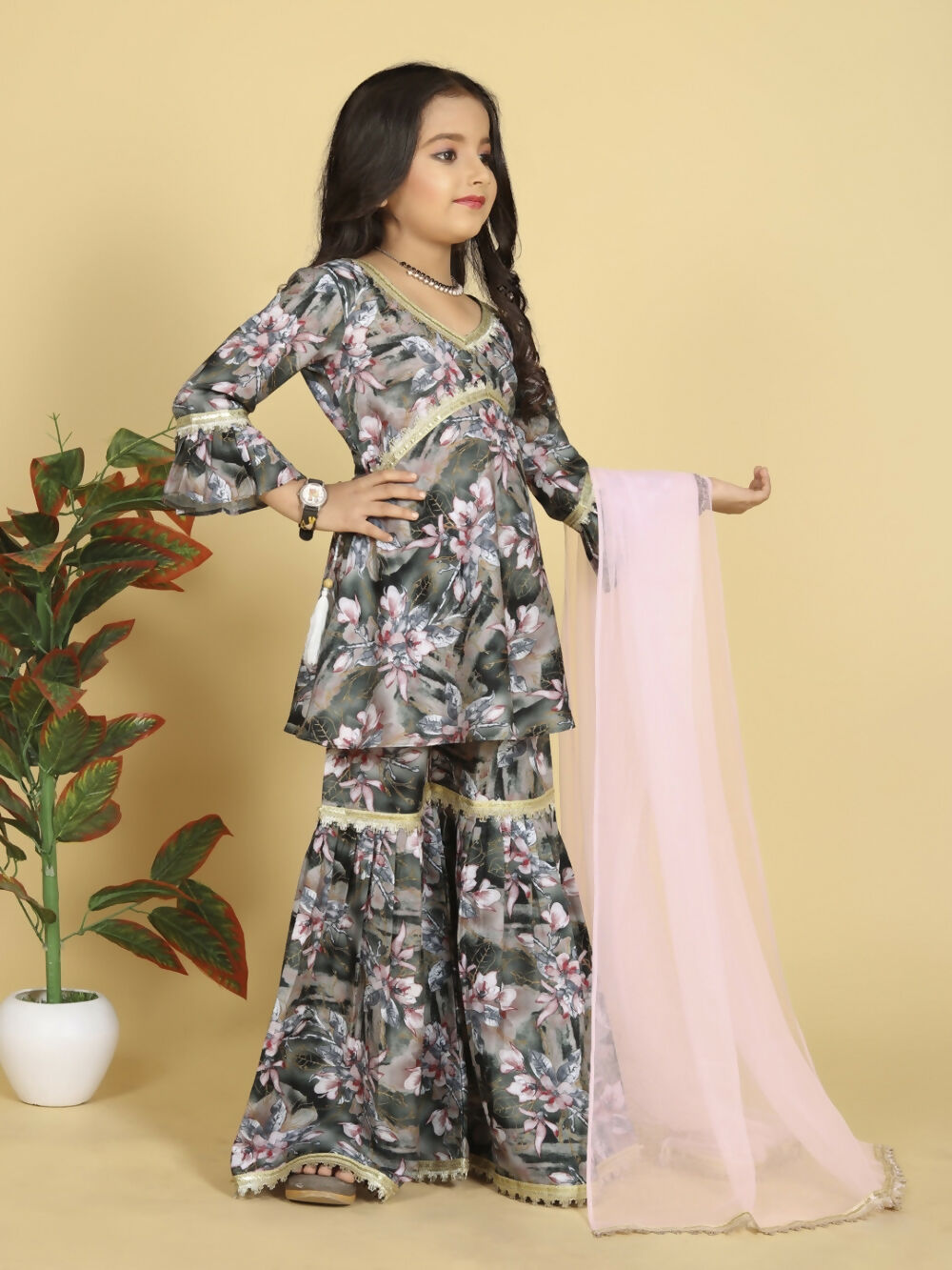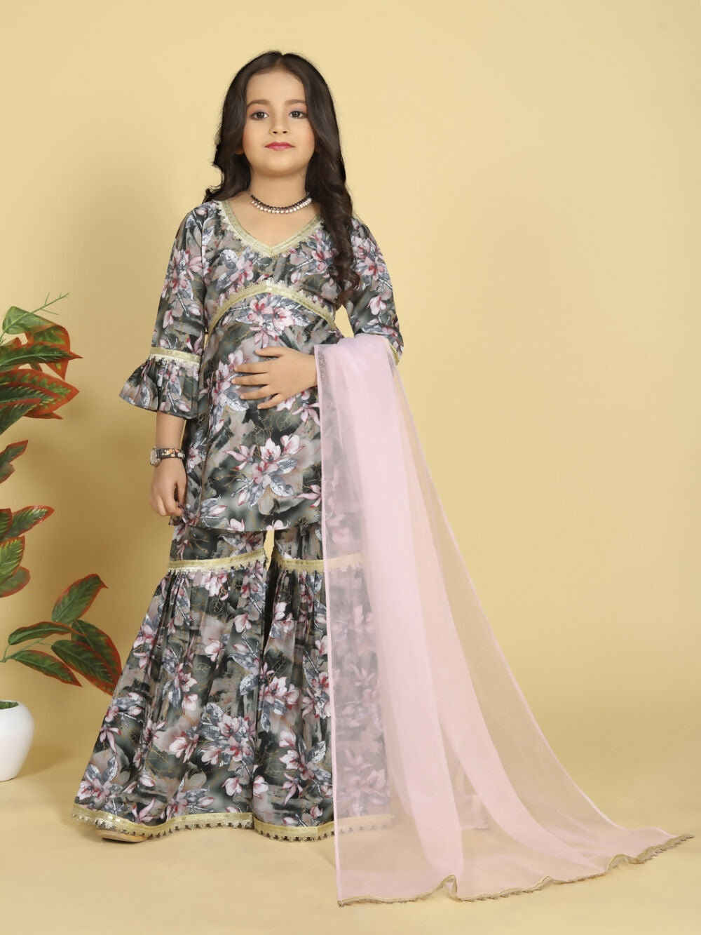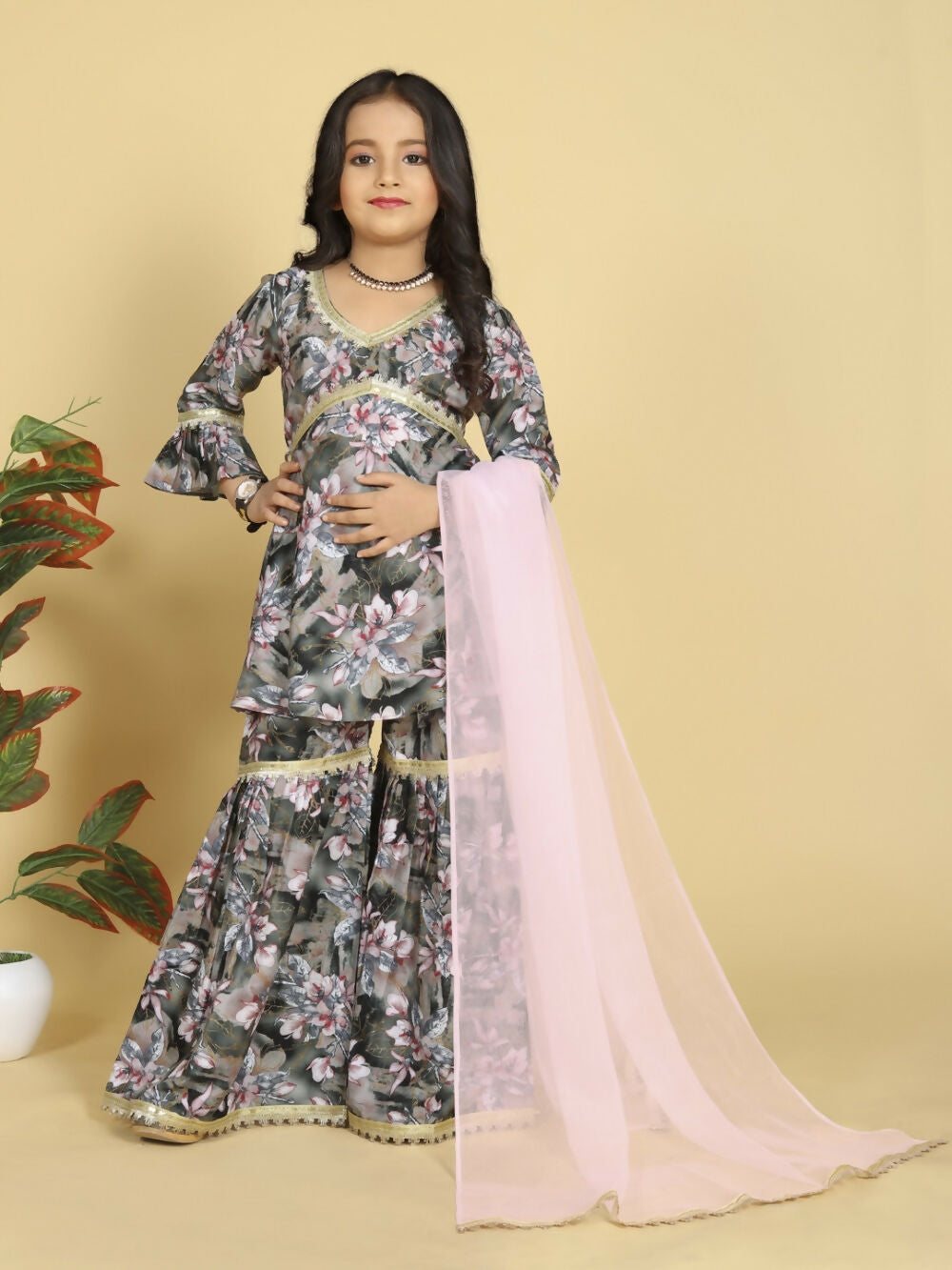 Divine Drape Girls Muslin Grey Printed Straight Kids Kurta Sharara With Dupatta