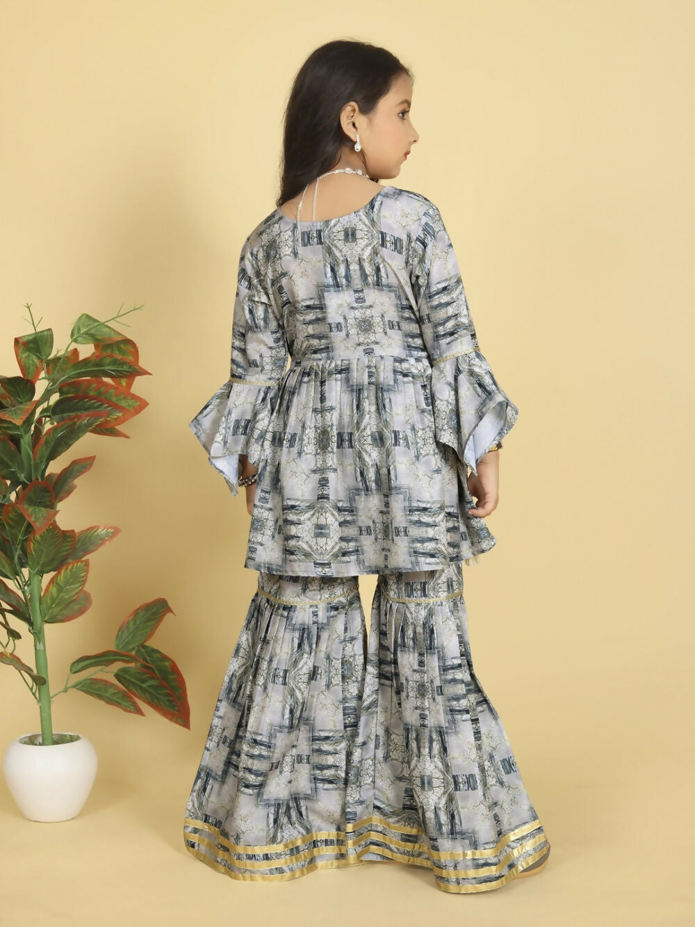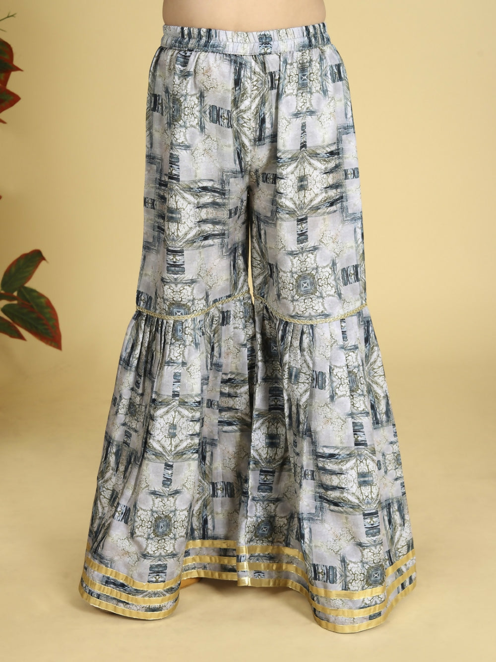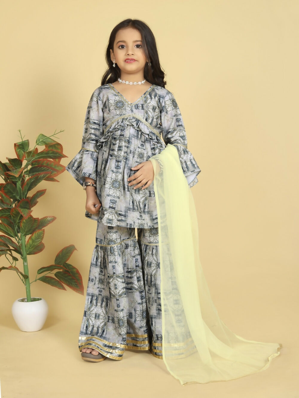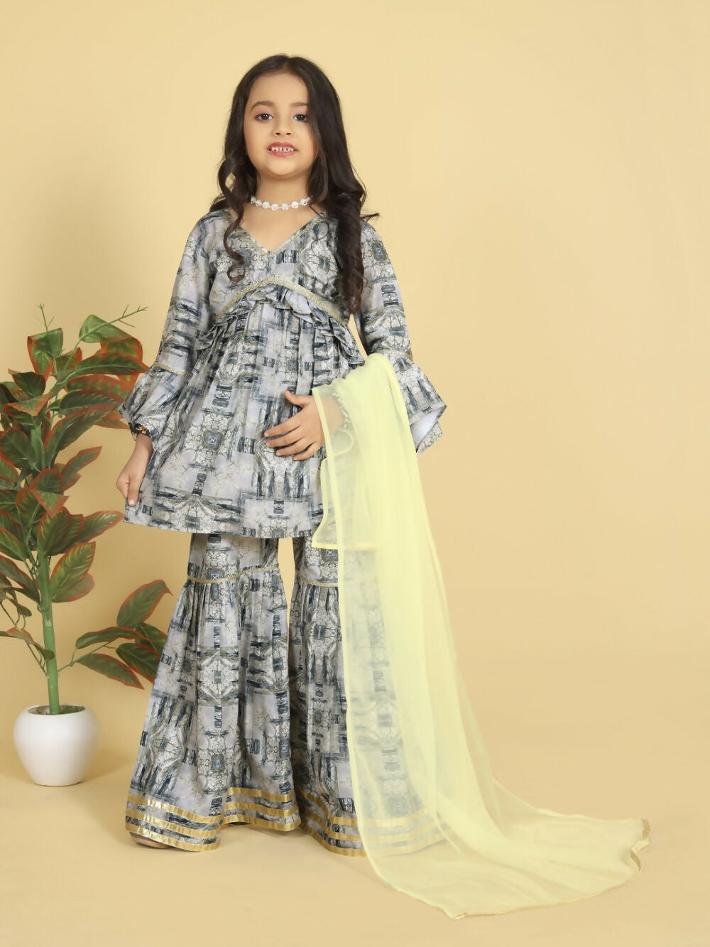 Divine Drape Girls Muslin Grey Printed Straight Kids Kurta Sharara With Dupatta