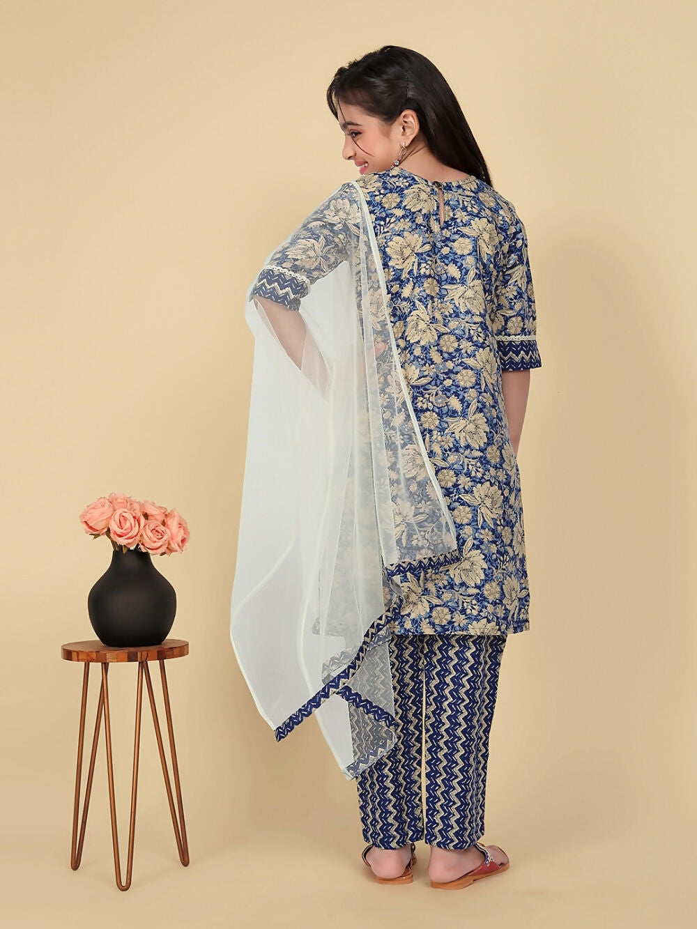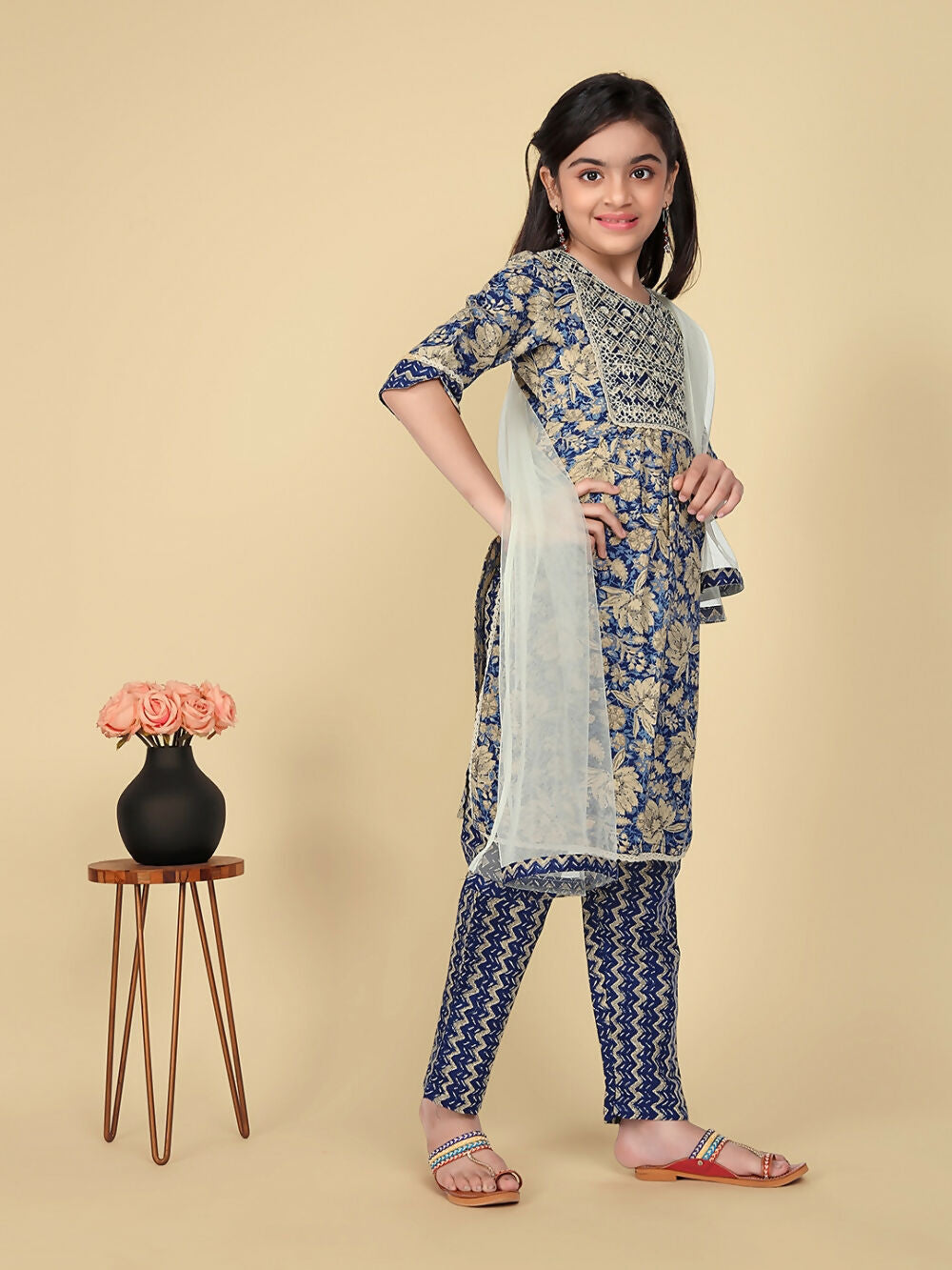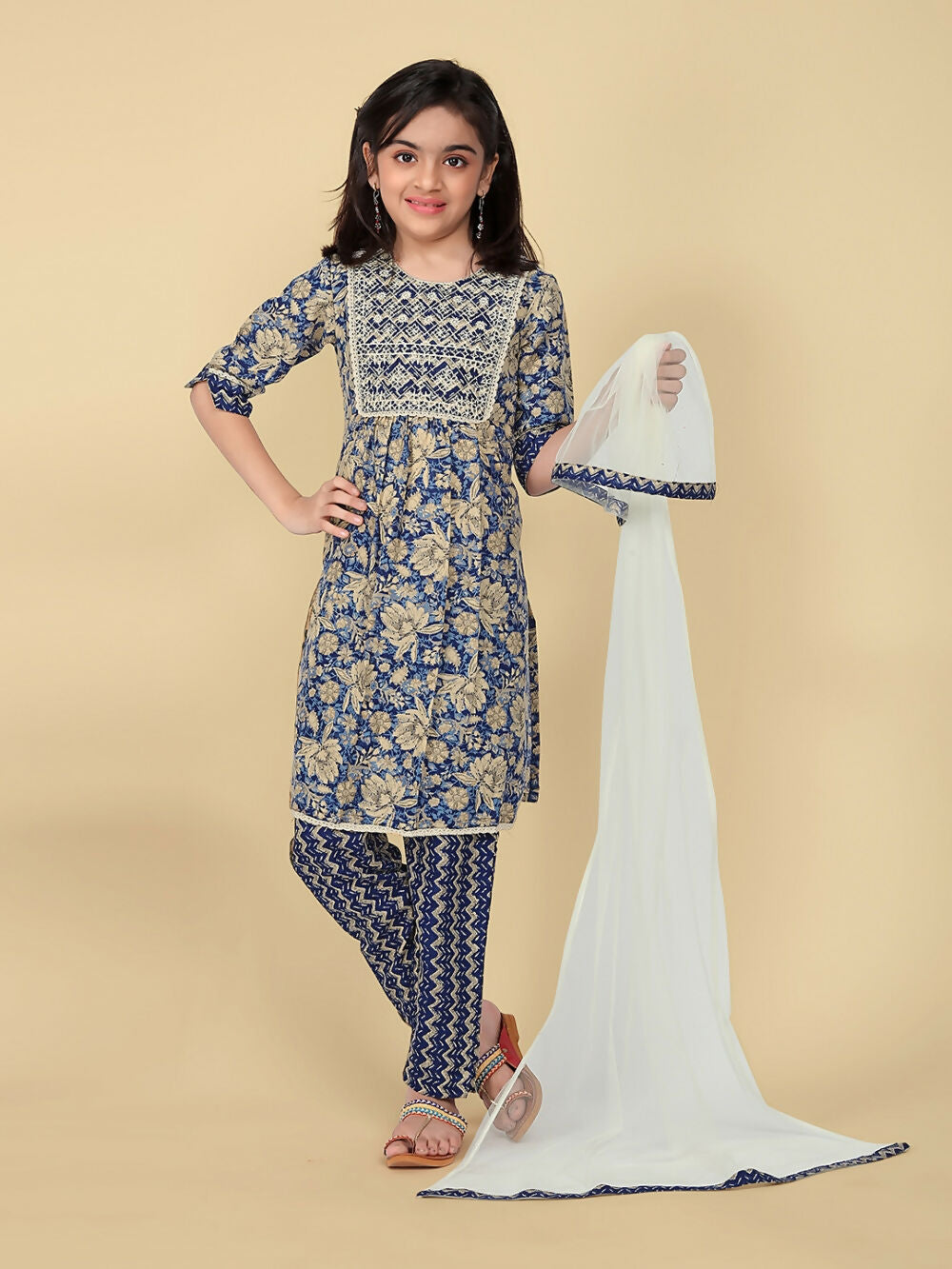 Divine Drape Girls Poly Cotton Blue Embroidered Straight Kids Kurta Pant With Dupatta