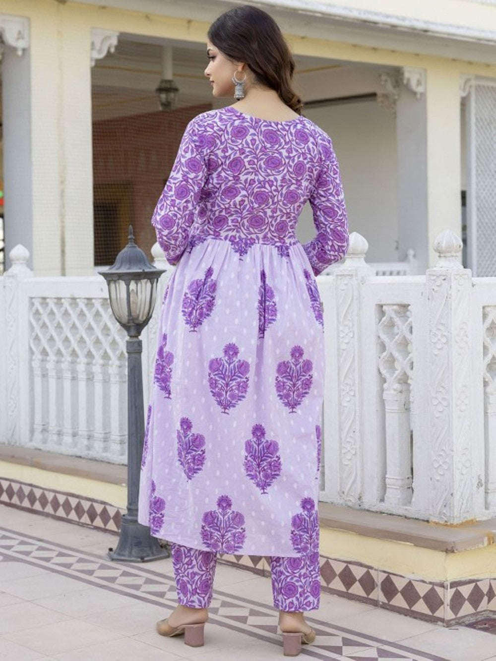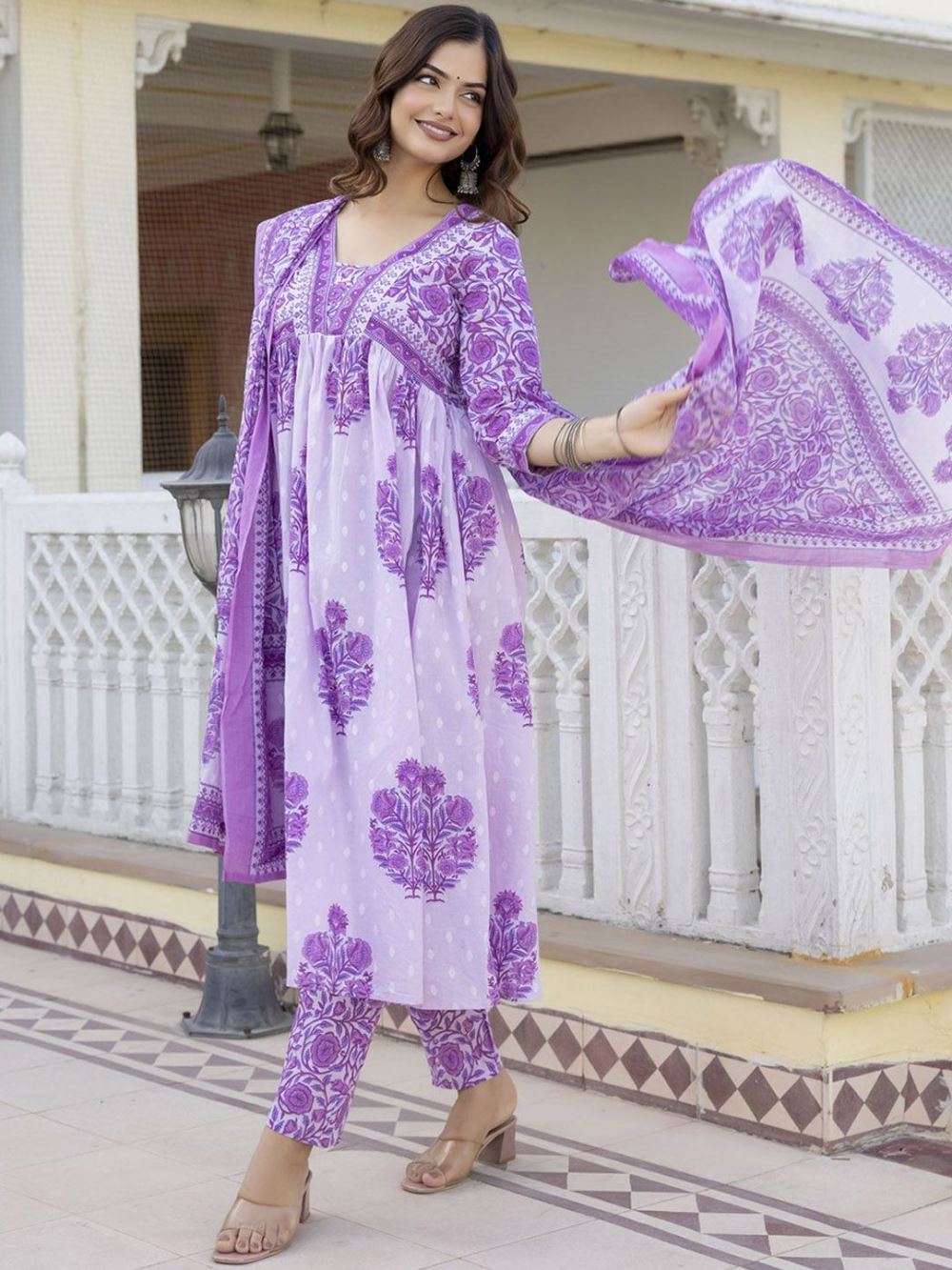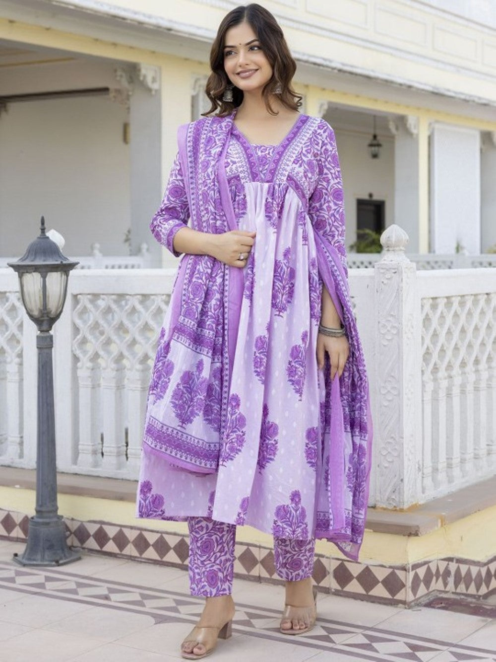 Divine Drape Women's Rayon Printed Anarkali Kurta Pant With Dupatta - Purple