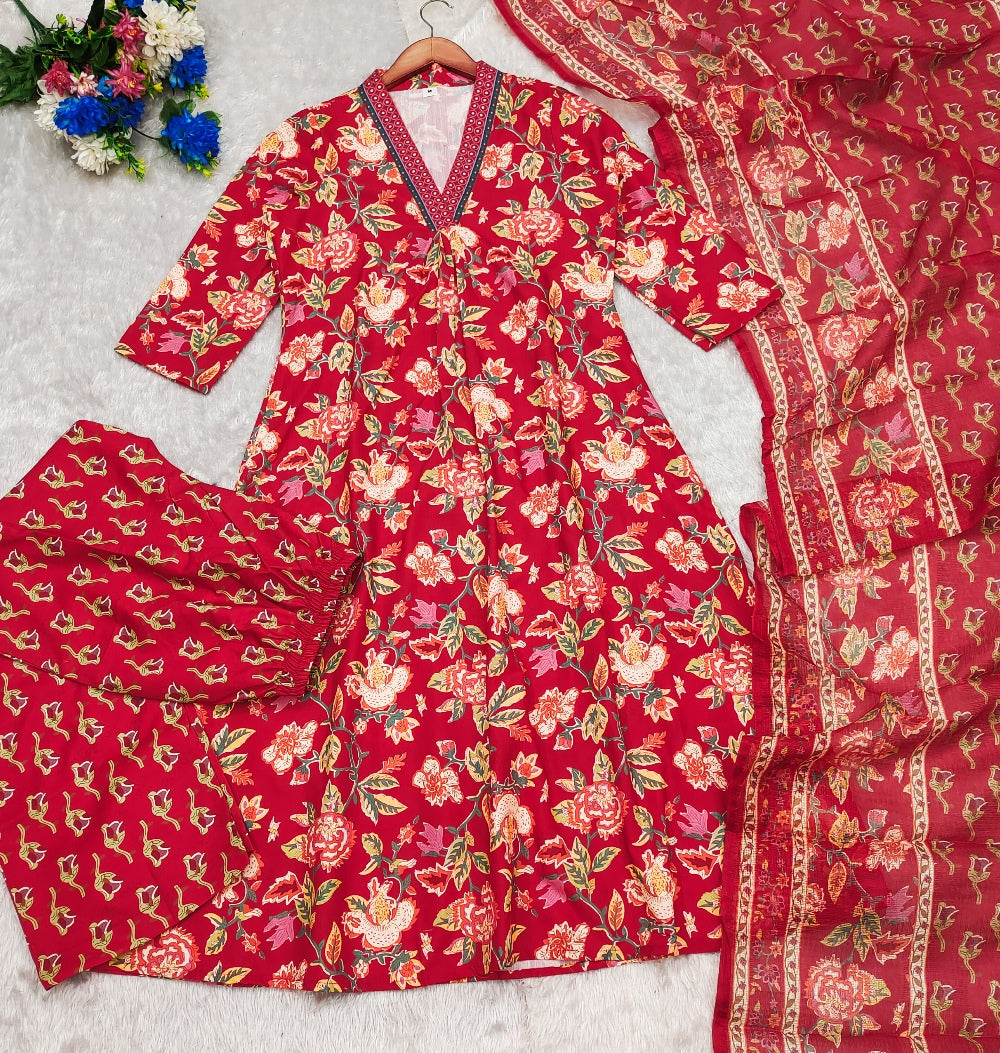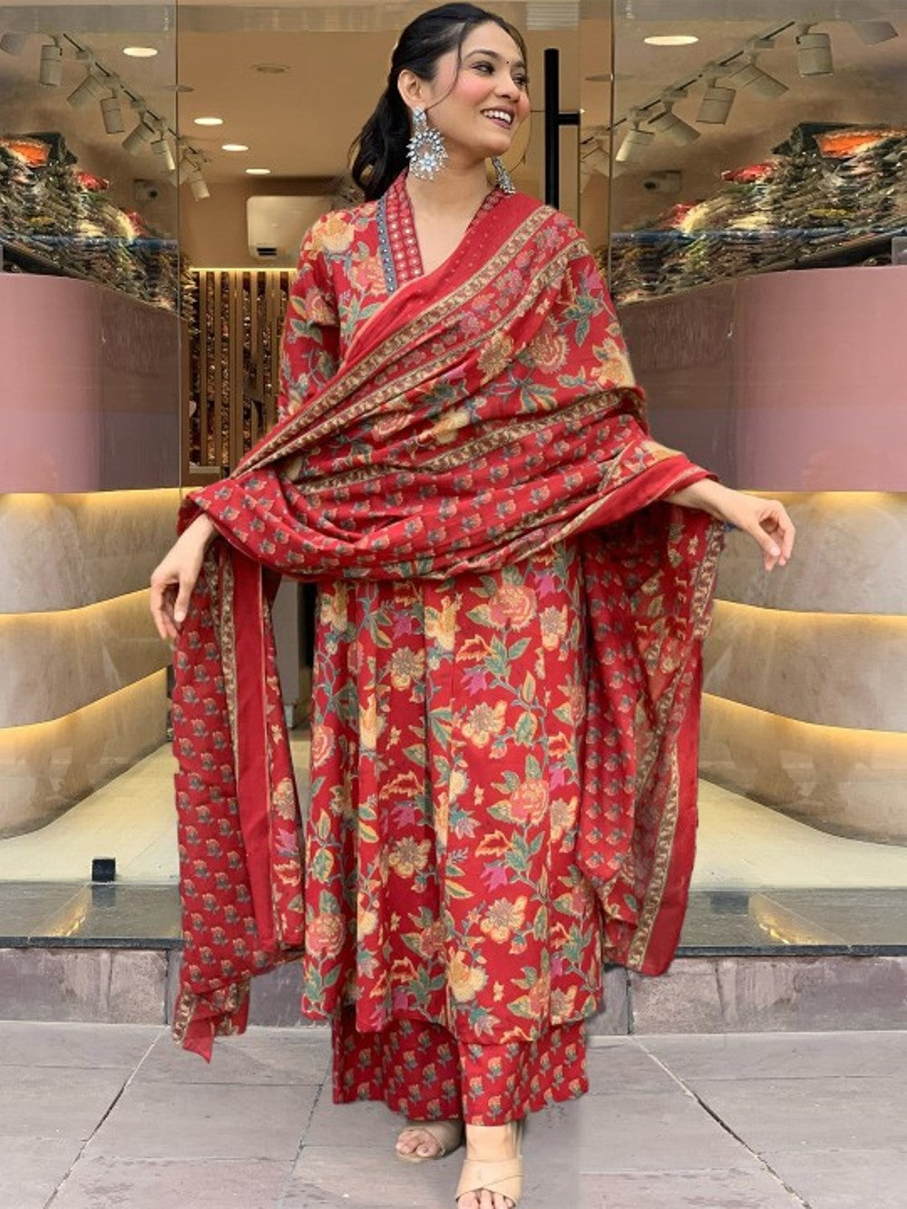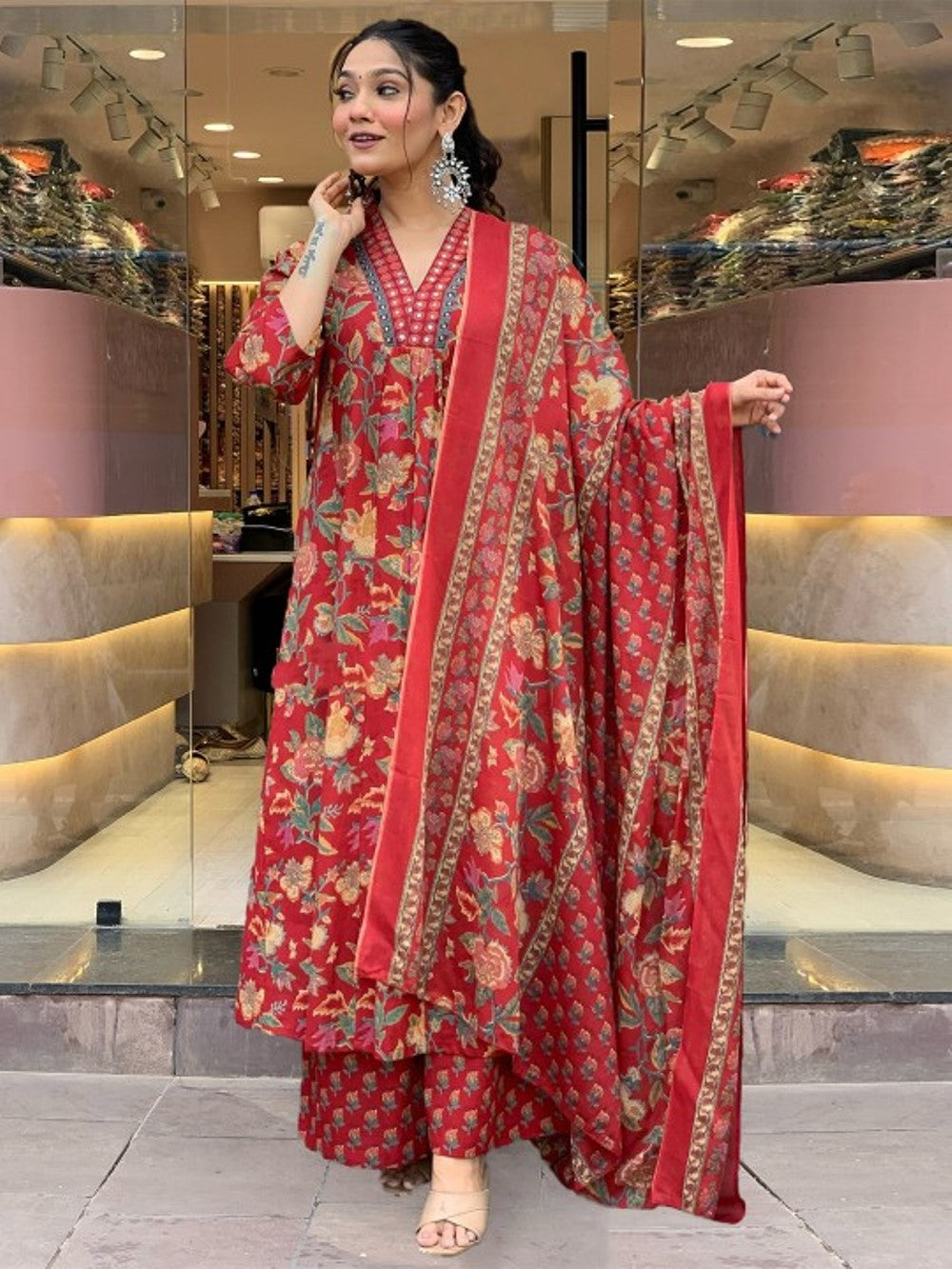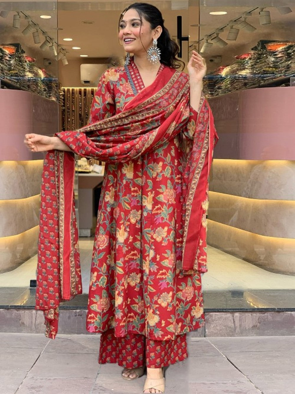 Divine Drape Women's Roman Slub Printed Anarkali Kurta Palazzo With Dupatta - Red