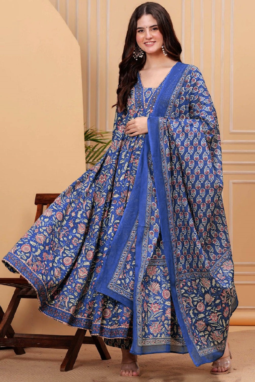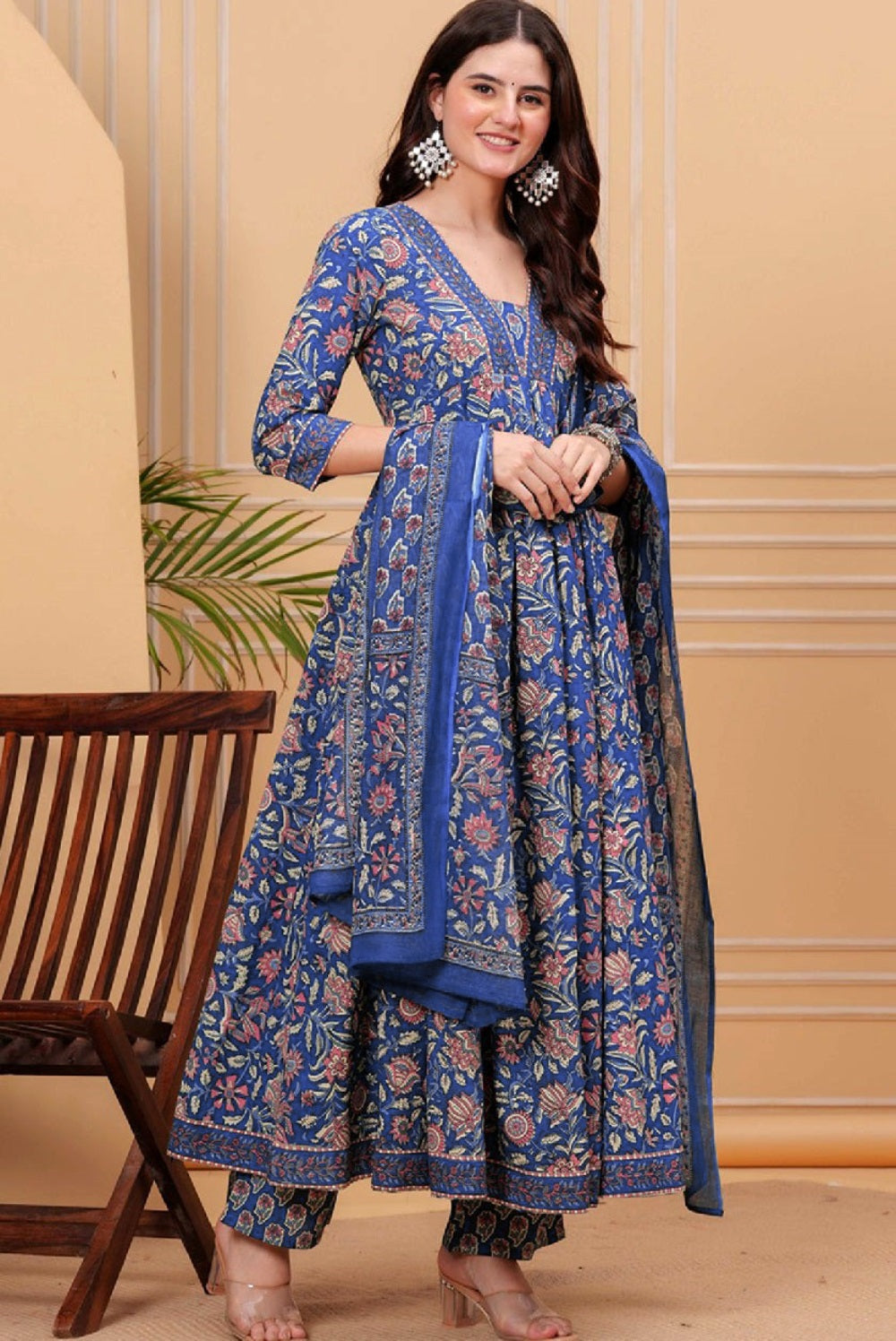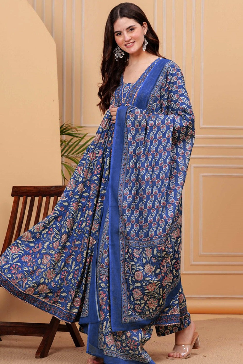 Divine Drape Women's Roman Slub Printed Anarkali Kurta Pant With Dupatta - Blue