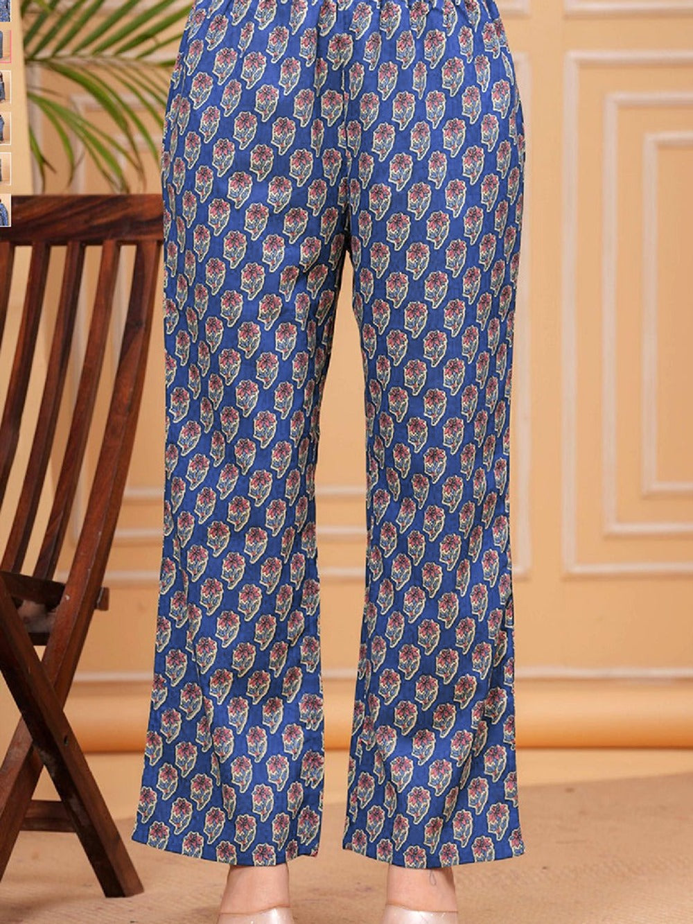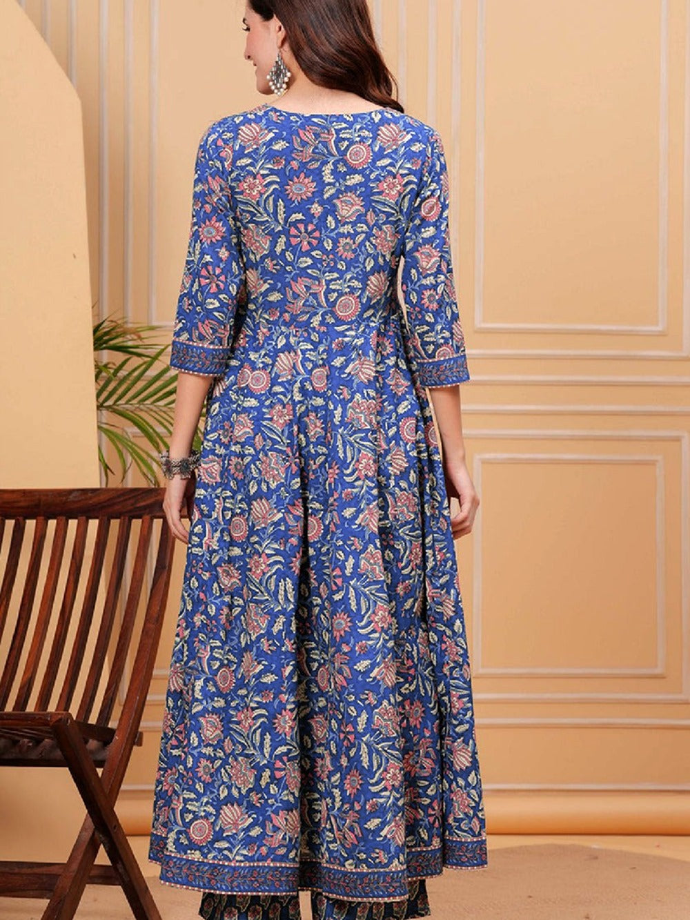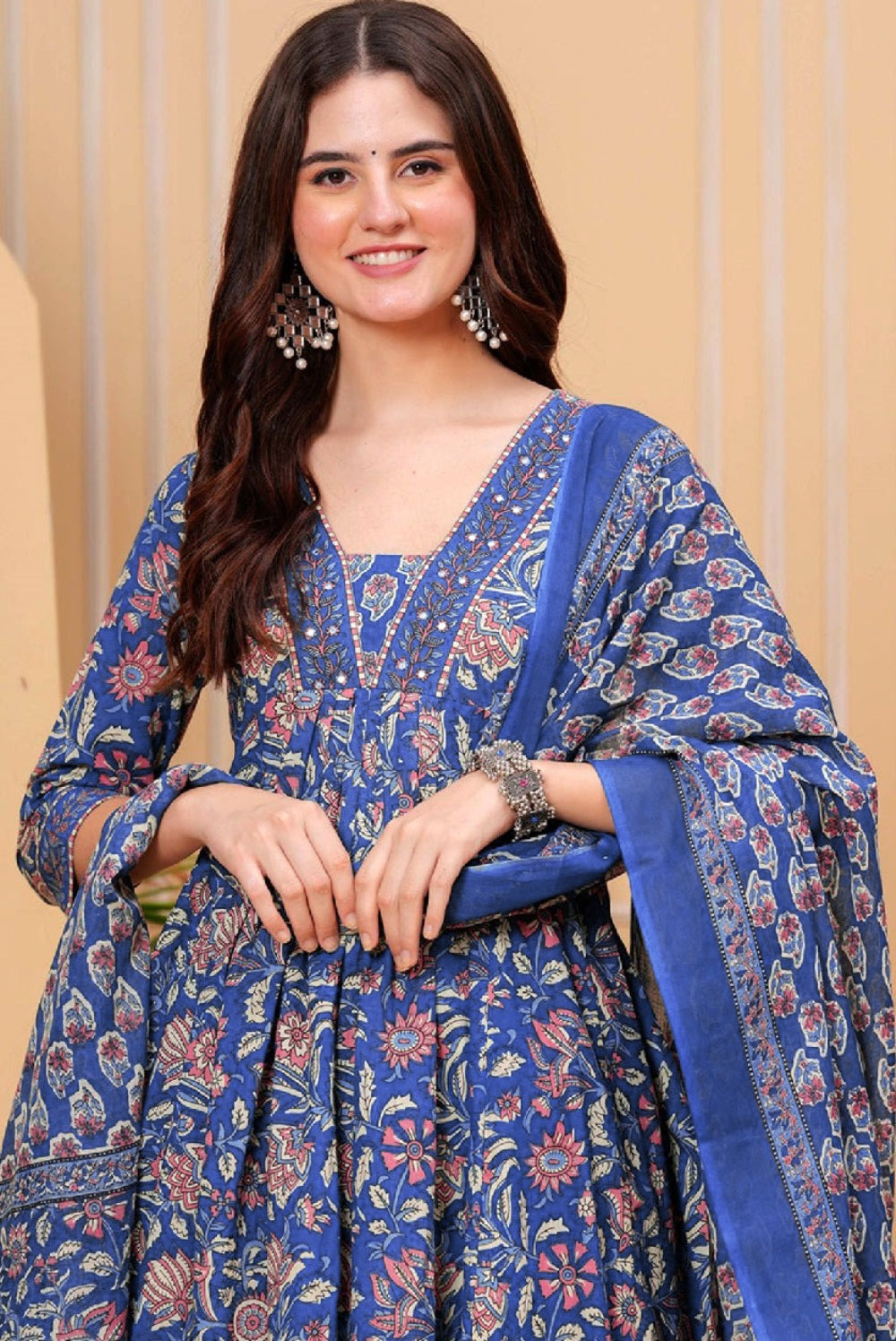 Divine Drape Women's Roman Slub Printed Anarkali Kurta Pant With Dupatta - Blue