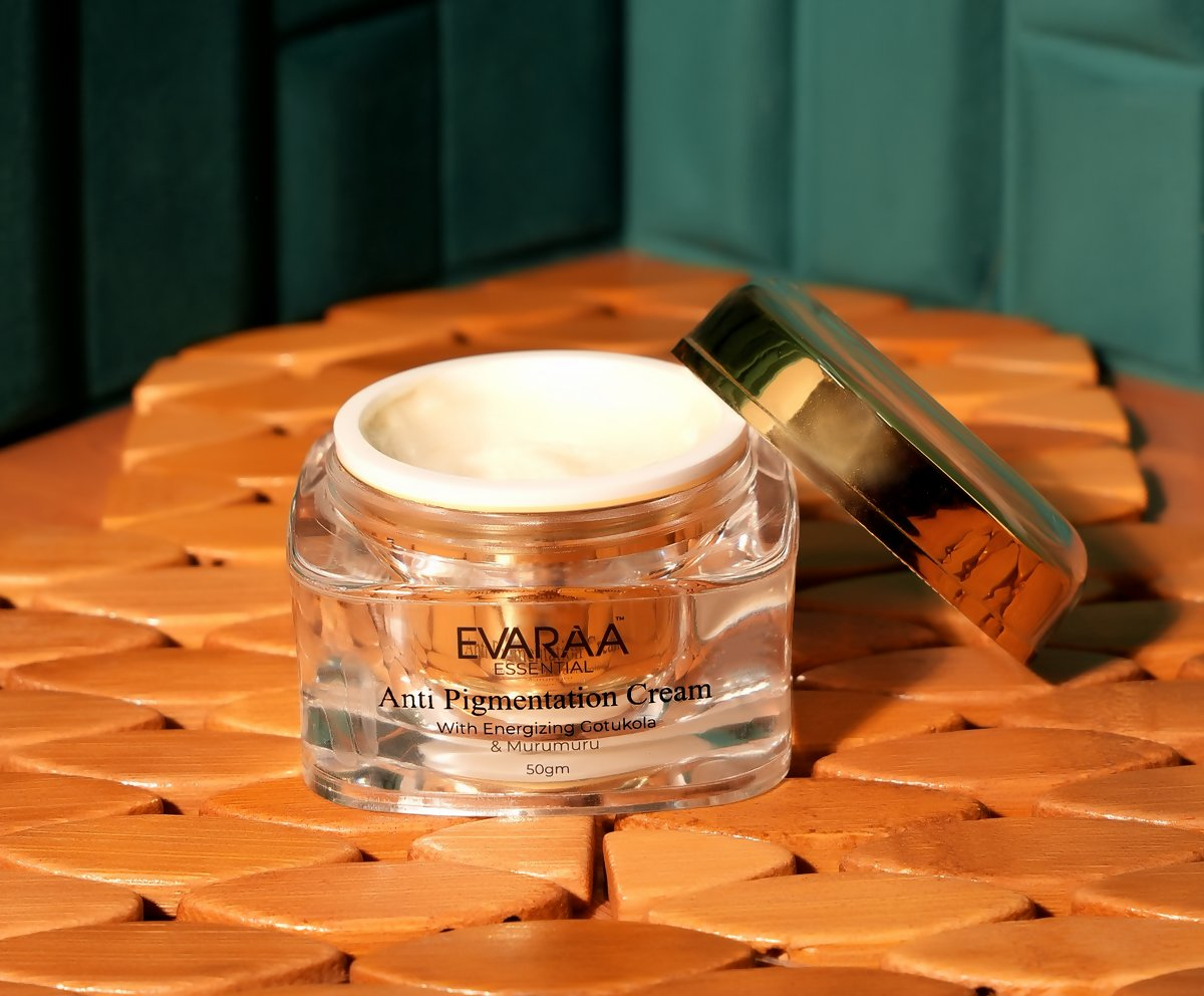 Evaraa Essential Anti Pigmentation Cream is a skincare product formulated with botanical extracts, oils, and butters. It is designed for daily facial use and is free from parabens, sulfates, and artificial fragrances.