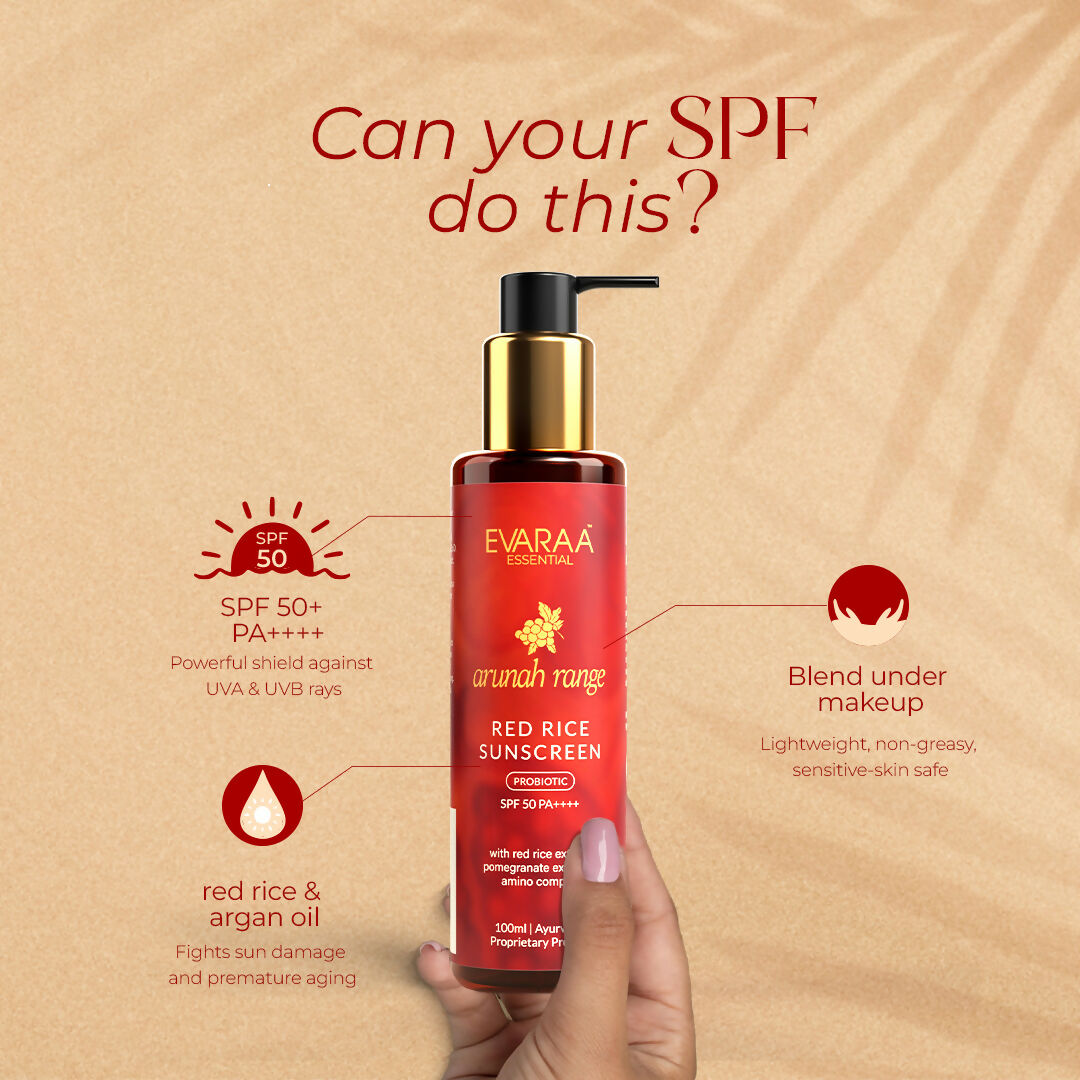 Evaraa Essential Red Rice Sunscreen SPF 50+ is a lightweight, paraben-free sunscreen formulated for general skin care. Designed for daily use, this product is suitable for a variety of skin types, including normal, dry, combination, and sensitive skin.