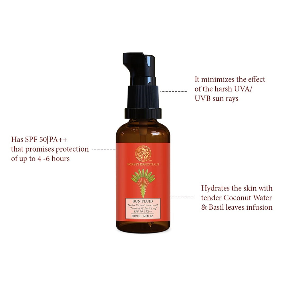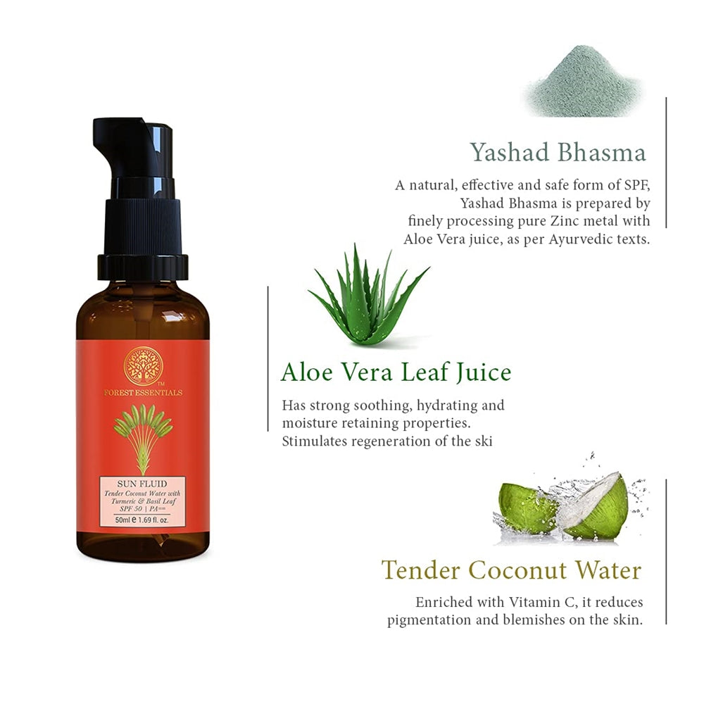 Forest Essentials Sun Fluid Tender Coconut Water with Turmeric & Basil Leaf SPF 50|PA + +