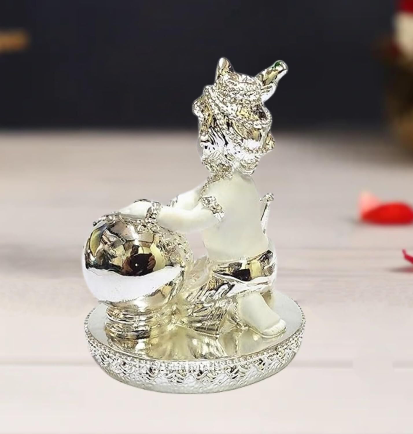 Gold Art India offers a stunning Shree Krishna Murti in Makhan Krishna form with 999 silver plating and a white teracotta body color. Lord Krishna is depicted having flute and sitting on a round base, he is savouring makhan from handi The Kirshnaji. This Devakinandan idol is versatile, suitable for home decoration, placement in the pooja room, use in Janmashtami rituals, and as a thoughtful gift for family and friends, housewarming ceremonies, and baby showers. Krishna ji is revered as the god of love, wealth, and prosperity. By bringing a statue of Krishna into your home or office, you invite the positive omens associated with him. The base material of the idol is poly-resin, and special attention is given to its lifelike appearance, particularly with the use of double-lens eyes. Krishna is also known by other names, including Balkrishna and Makhan Krishna. Bring home this stunning Makhan Krishna l figurine from Gold Art India and add a touch of spirituality and beauty to your space.