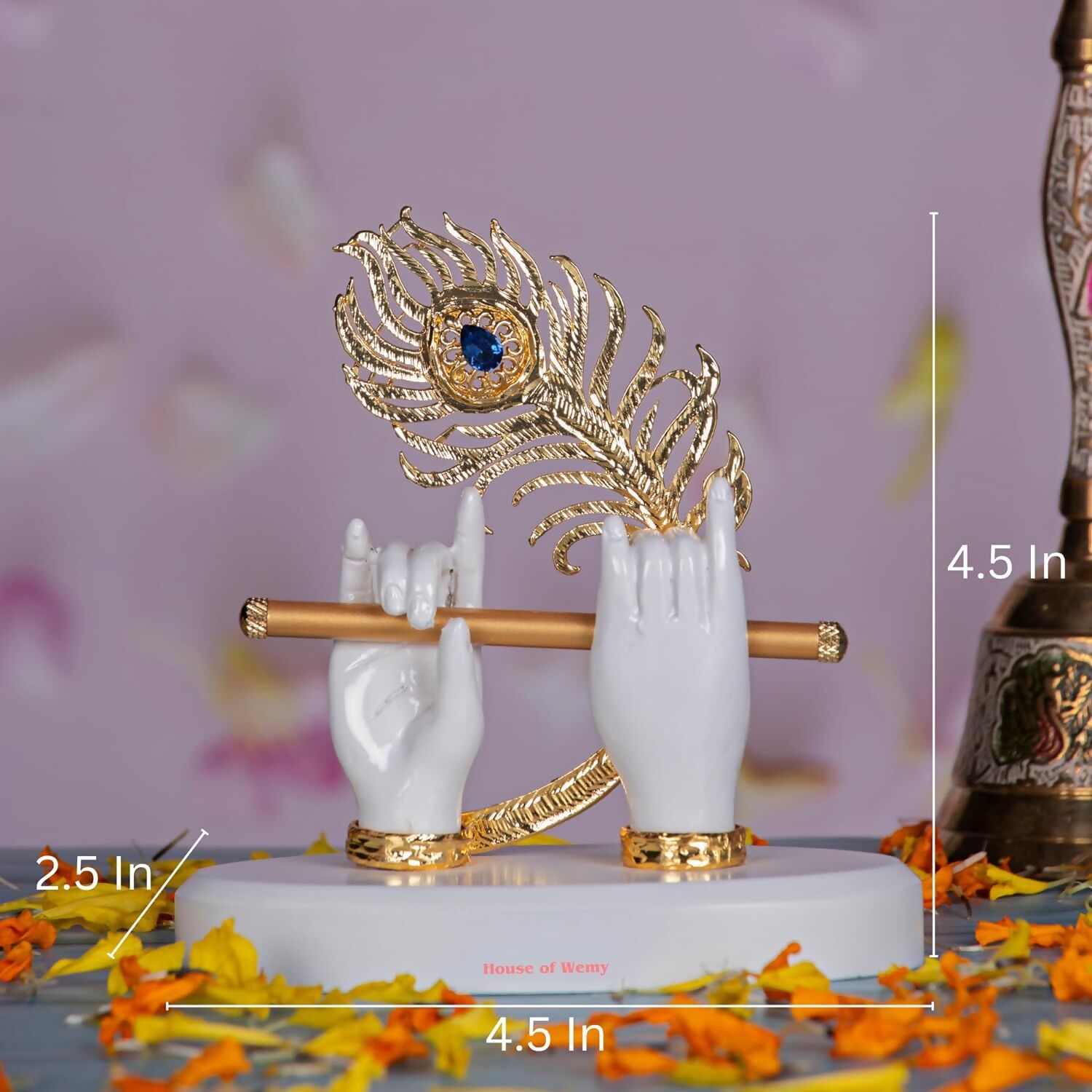 House Of Wemy Gold-Polished Melody Krishna Hands Idol with Flute and Peacock Feather - White