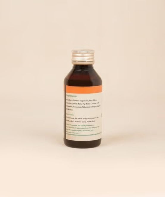 Jeevamritham is based on a powerful Kashayam, a herbal decoction prepared with elements of Fig, Jamun, Vaghai, and Varuvelan trees. Other ingredients used in the preparation of Jeevamritam are known to have powerful healing qualities in traditional Indian supplements. Some of these ingredients include Amla, Lemon, Indian Sarsaparilla, Liquorice, Cardamom, Clove, Albizia Lebbeck bark, Fig bark, White leadwort, Brahmin ginseng, Talispatra, Nutmeg, Gingelly oil, Ghee and Coconut milk.