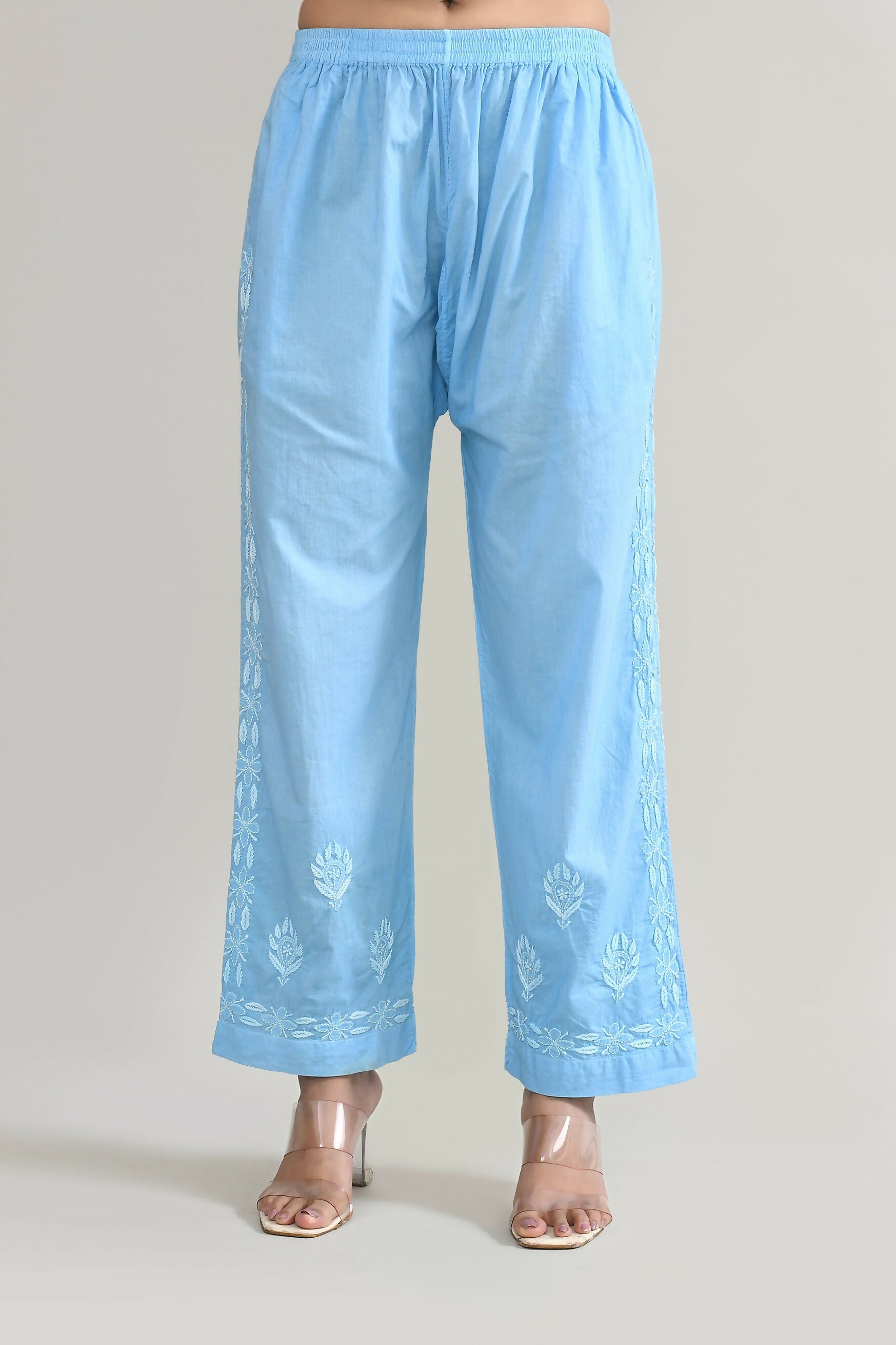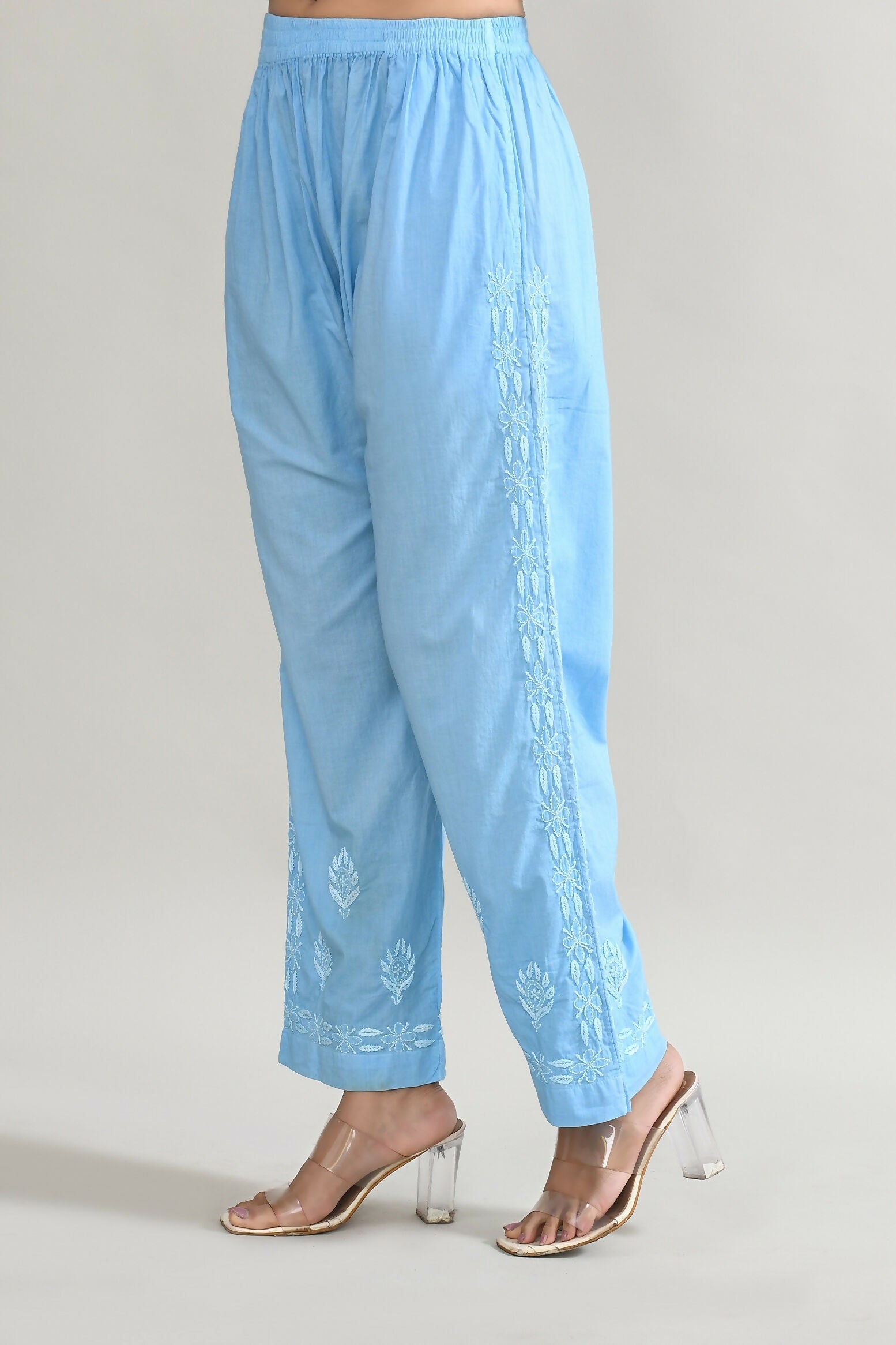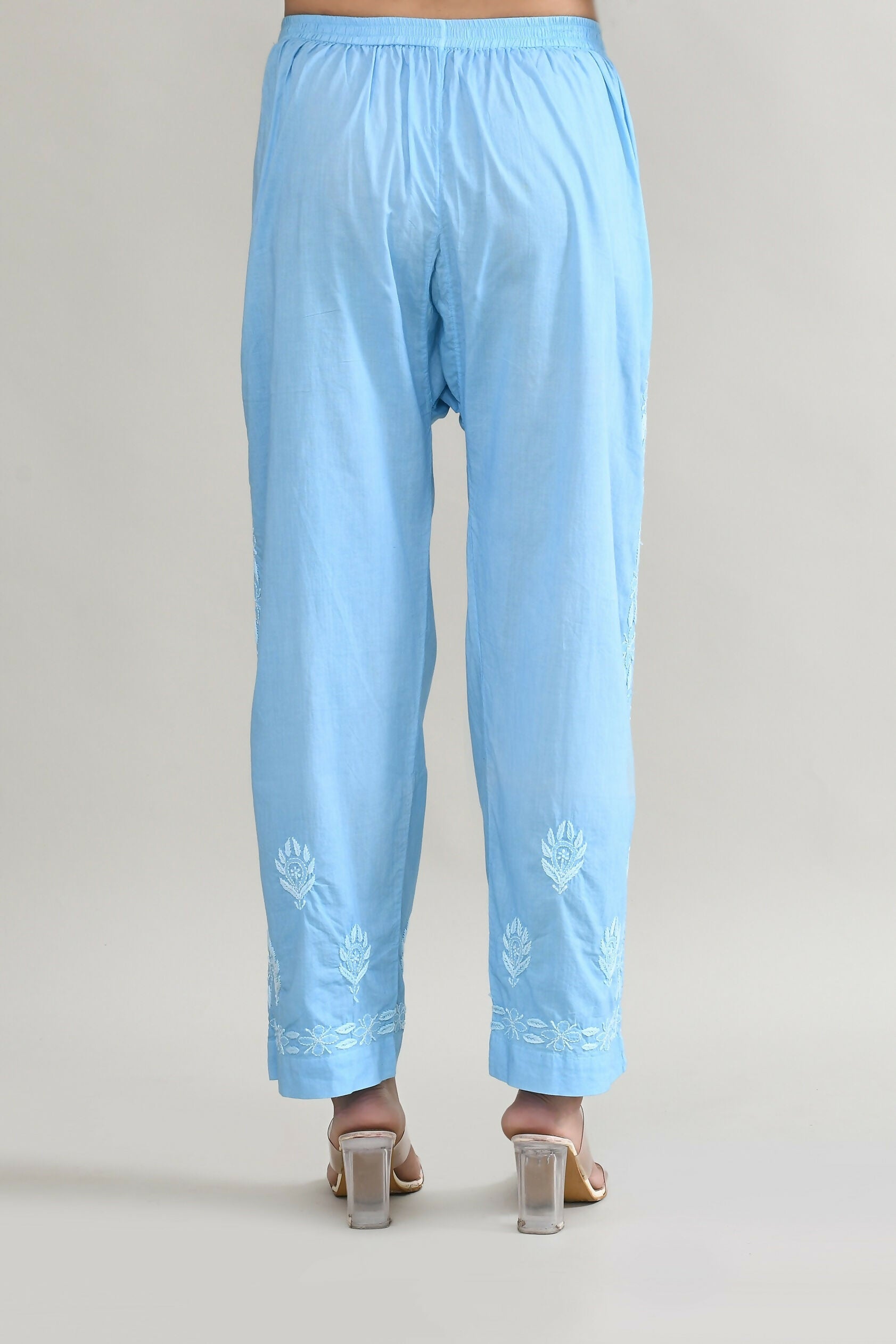 Joban Fashion Womens Cotton ChikanKari Sky Blue & White Cord set