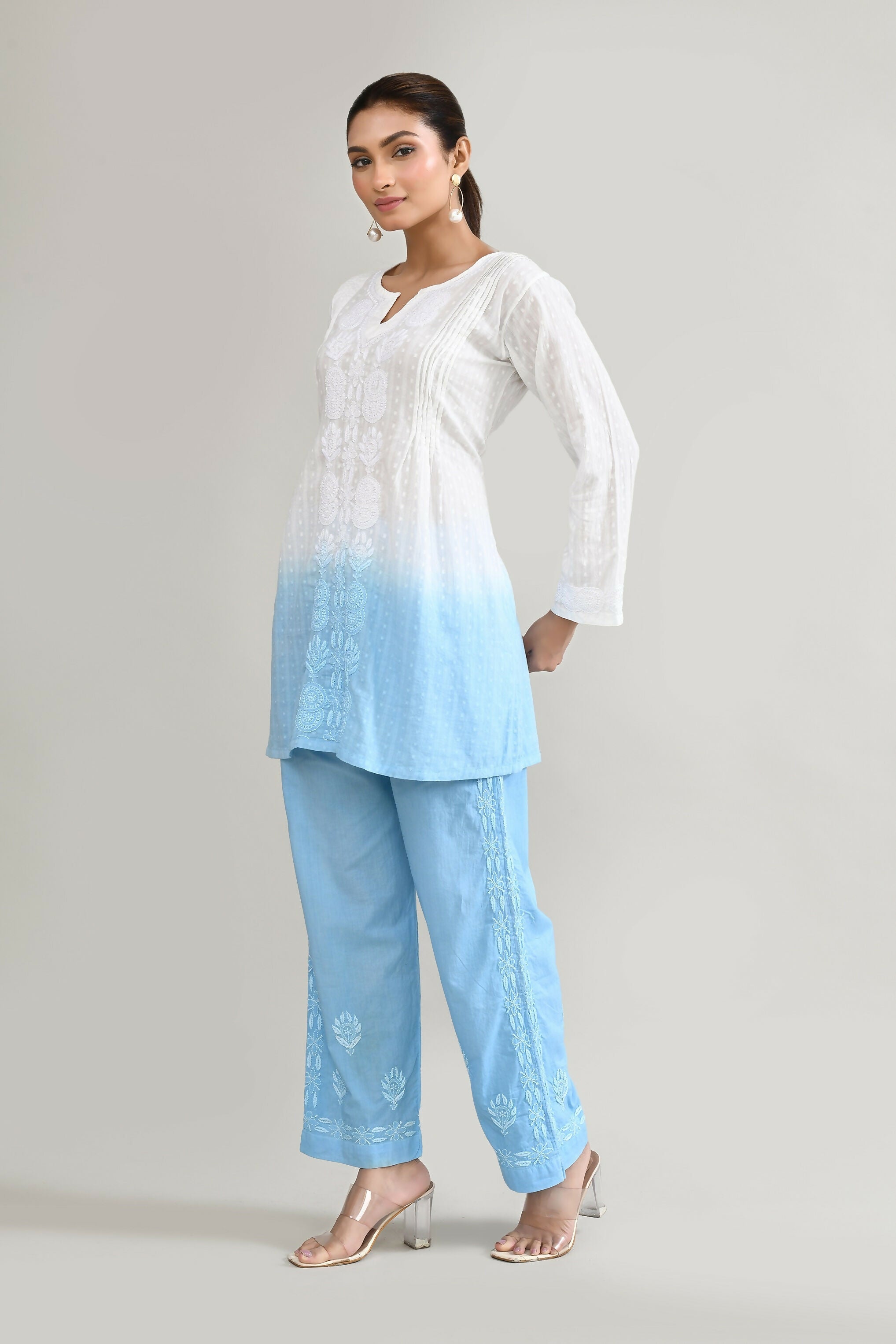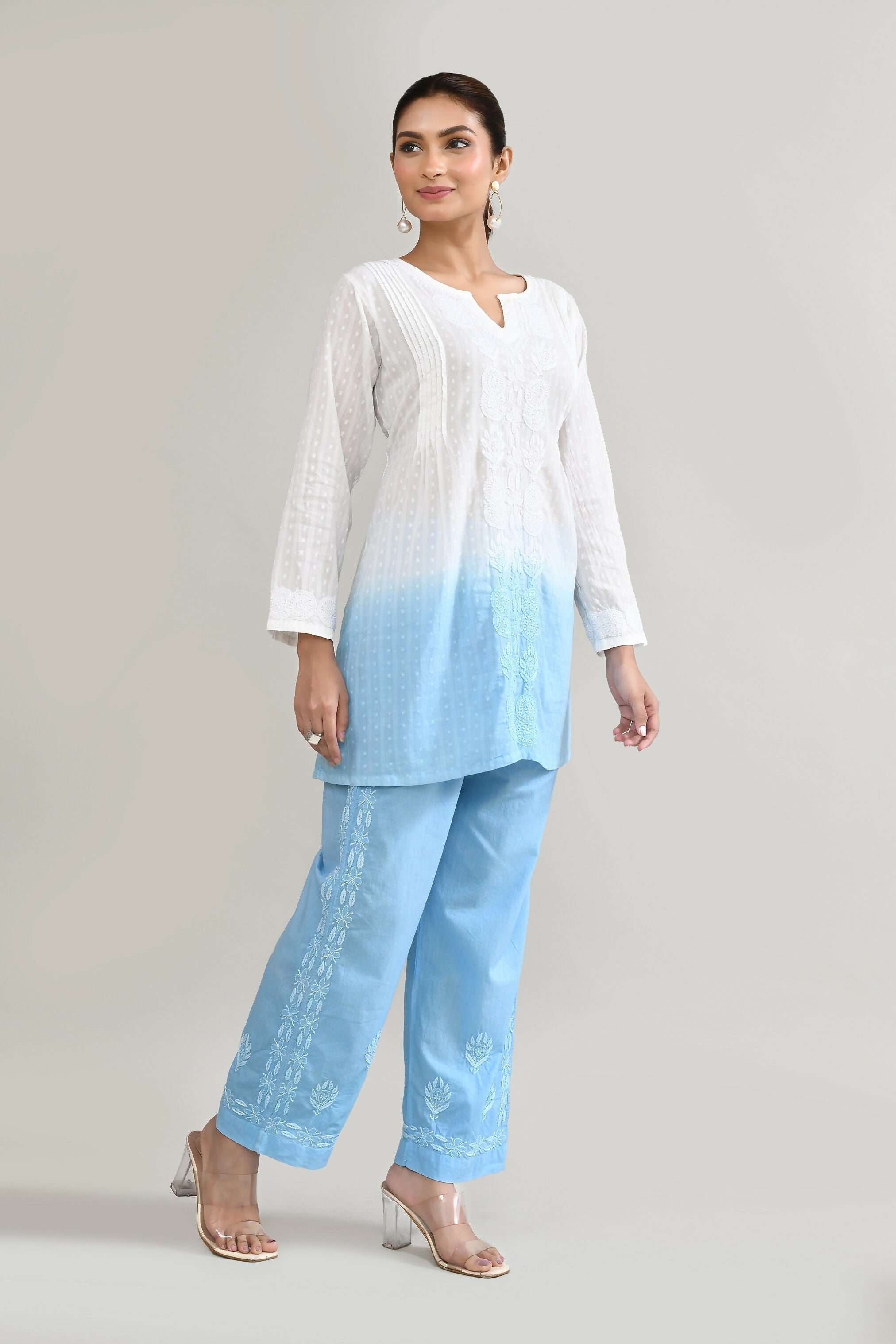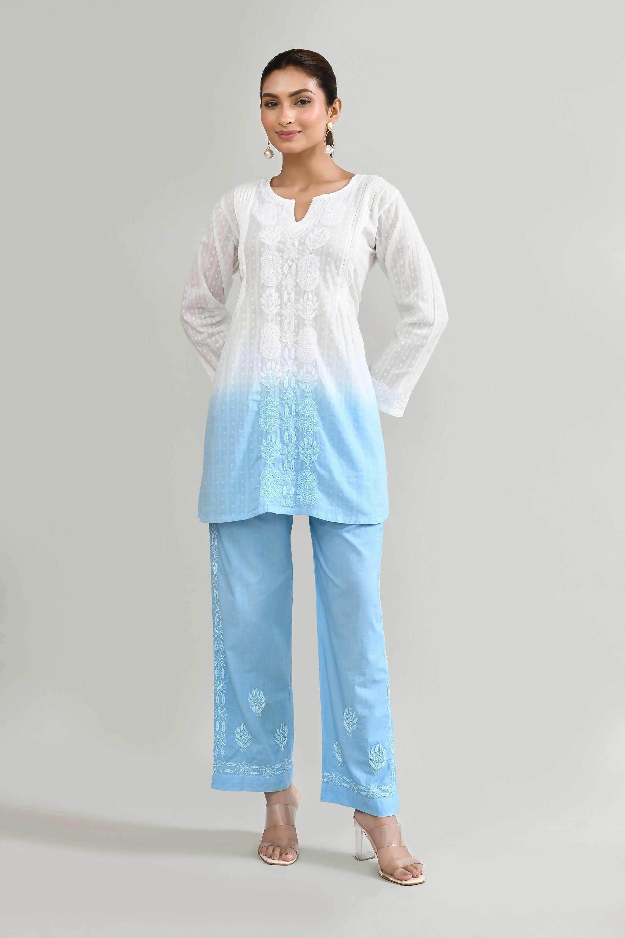 Joban Fashion Womens Cotton ChikanKari Sky Blue & White Cord set