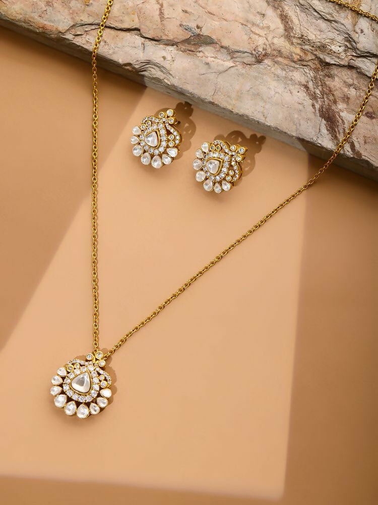 Make a regal impression with Ruby Raang’s Kundan Antique Finish Earrings and Necklace Set featuring traditional Kundan work paired with rich mehendi tones. Tthis handcrafted set captures the essence of timeless Indian elegance. The necklace is adorned with intricate detailing and a graceful design that adds a luxurious finish to any ethnic outfit. Matching earrings bring perfect balance and charm to the look. Lightweight and versatile, ideal for festive occasions, weddings, or cultural celebrations. Let your style speak of heritage and grace with this beautifully crafted Kundan set from Ruby Raang.