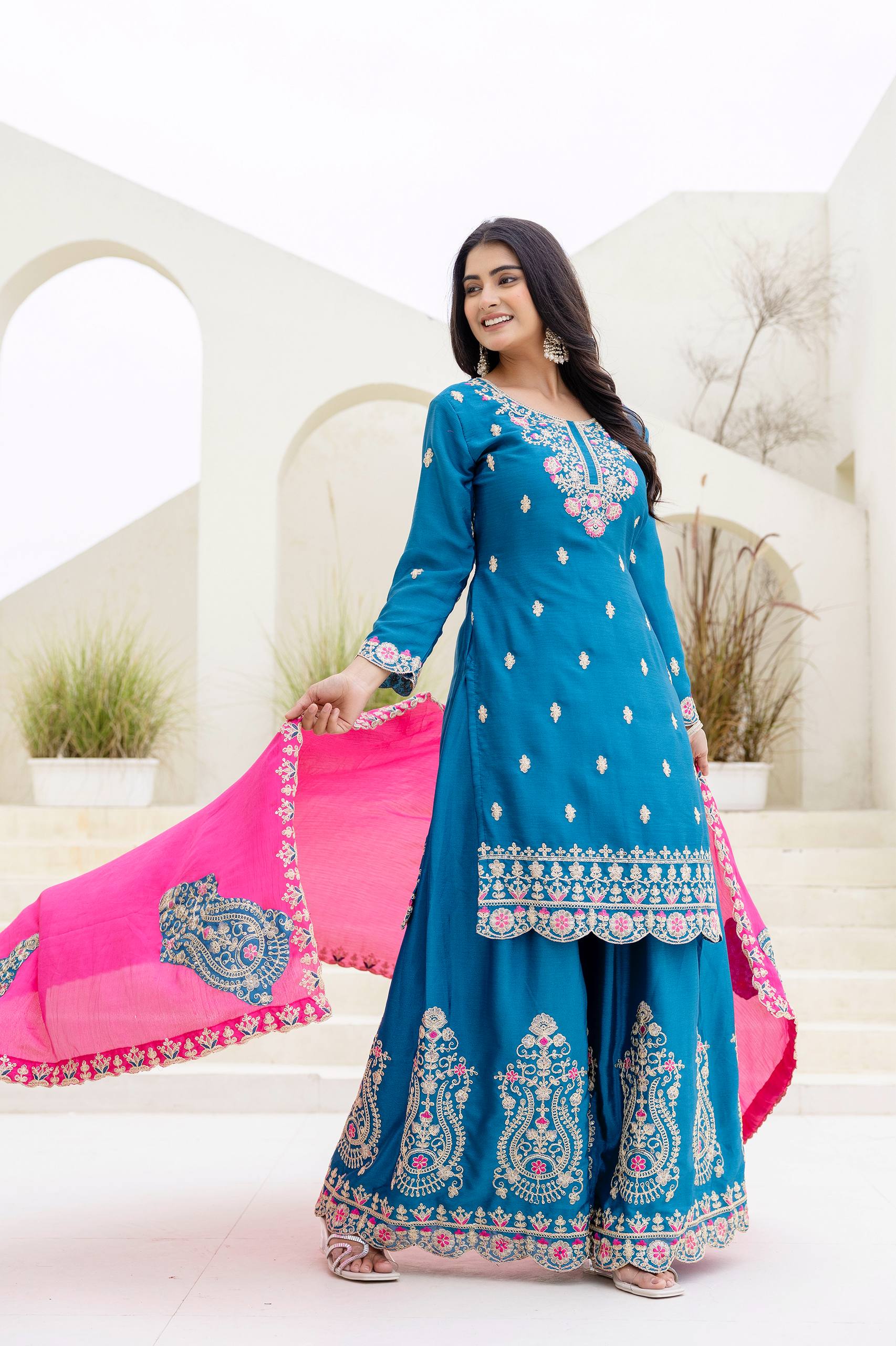 Lehenga Mart Designer Chinon Ready to wear Kurta Palazzo Dupatta for Women - Sky blue