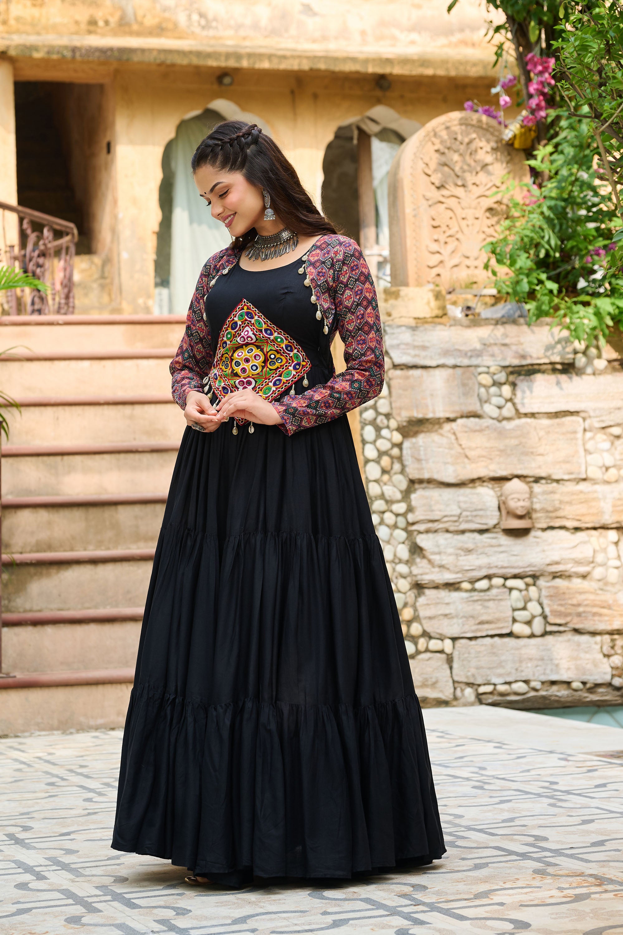 Lorenvalley Fashion Black Rayon Kutchi Gamthi Embroidered Work & Cotton Print Work Gown