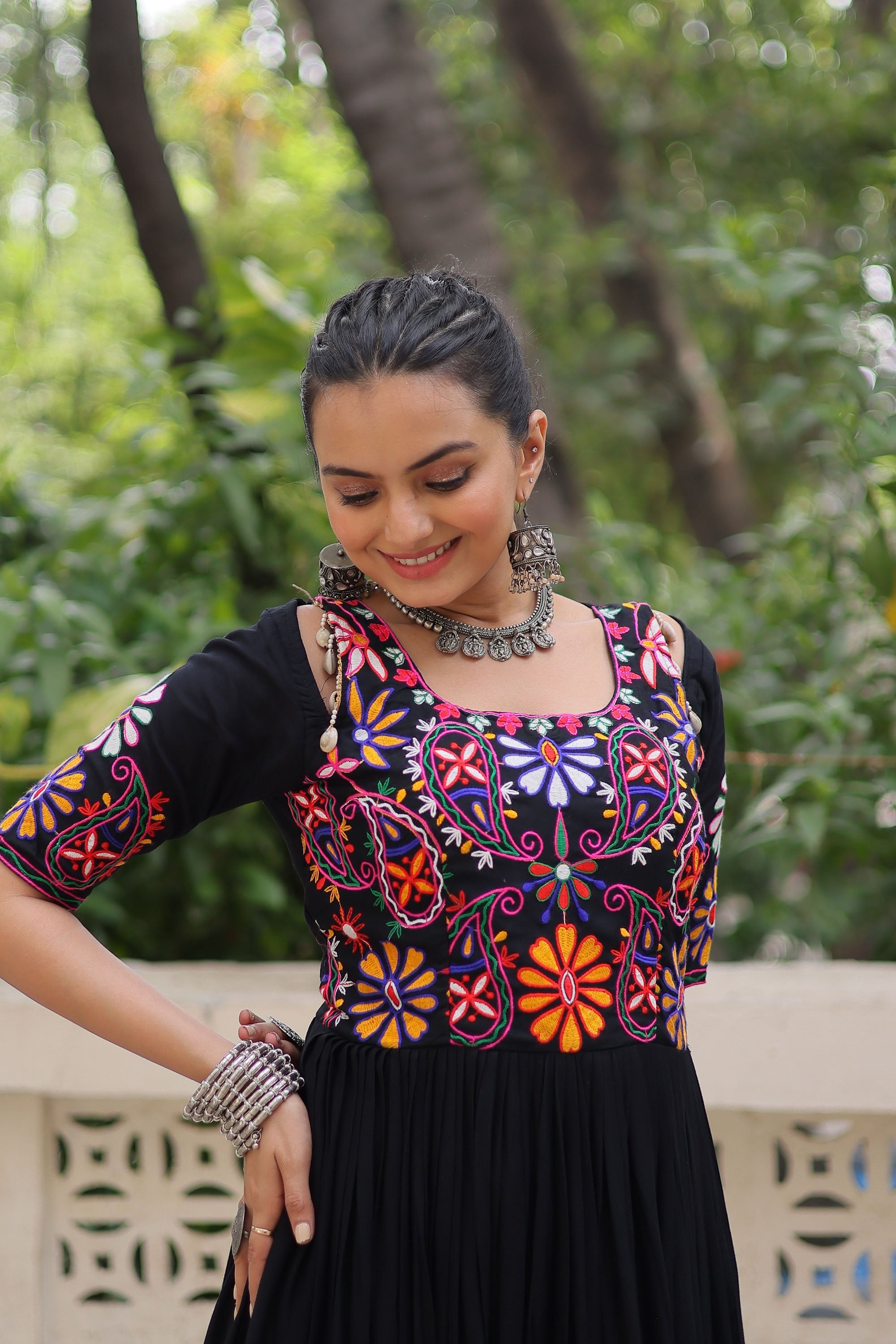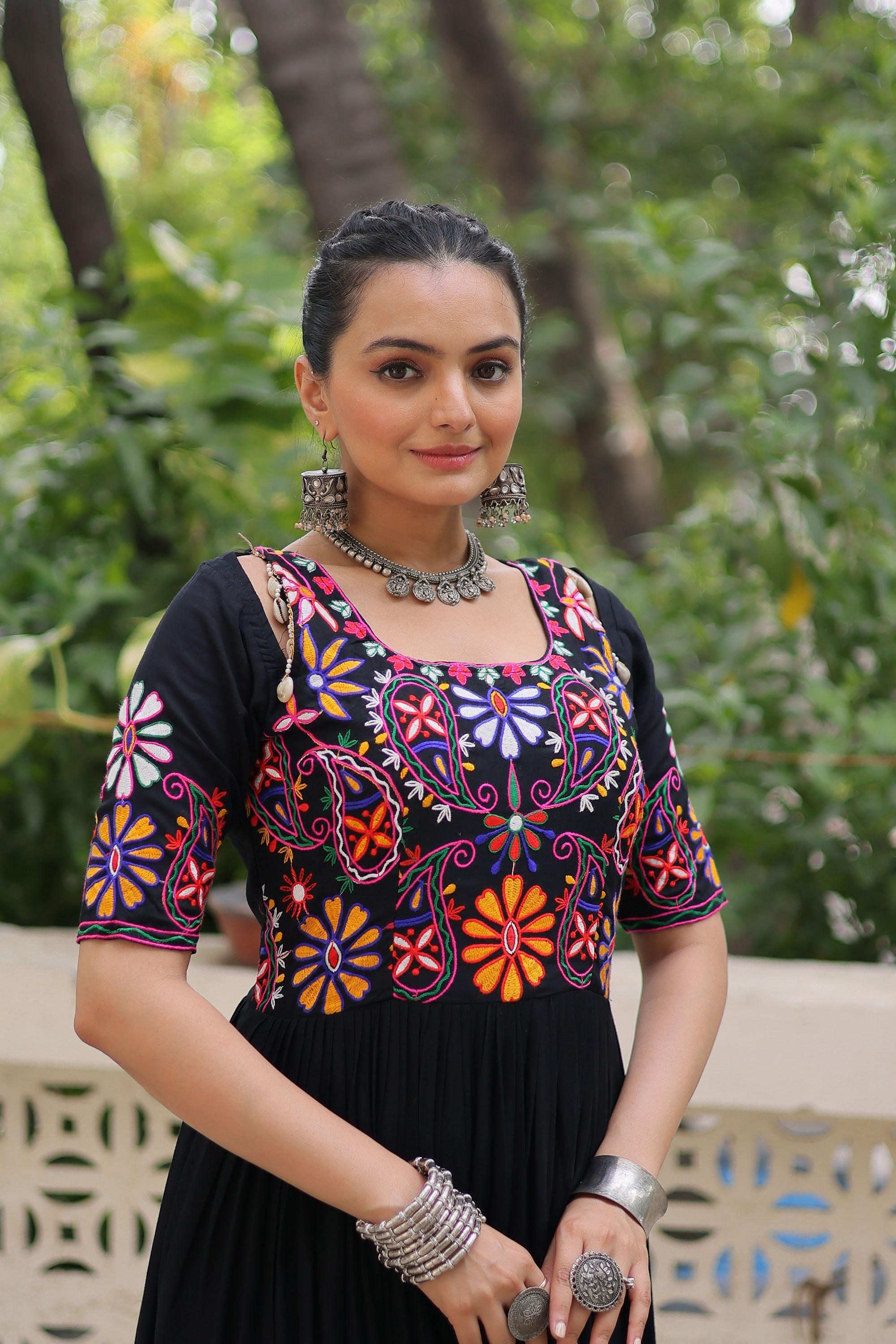 Lorenvalley Fashion Black Rayon with Kutchi Gamthi Embroidered Thread Work Gown
