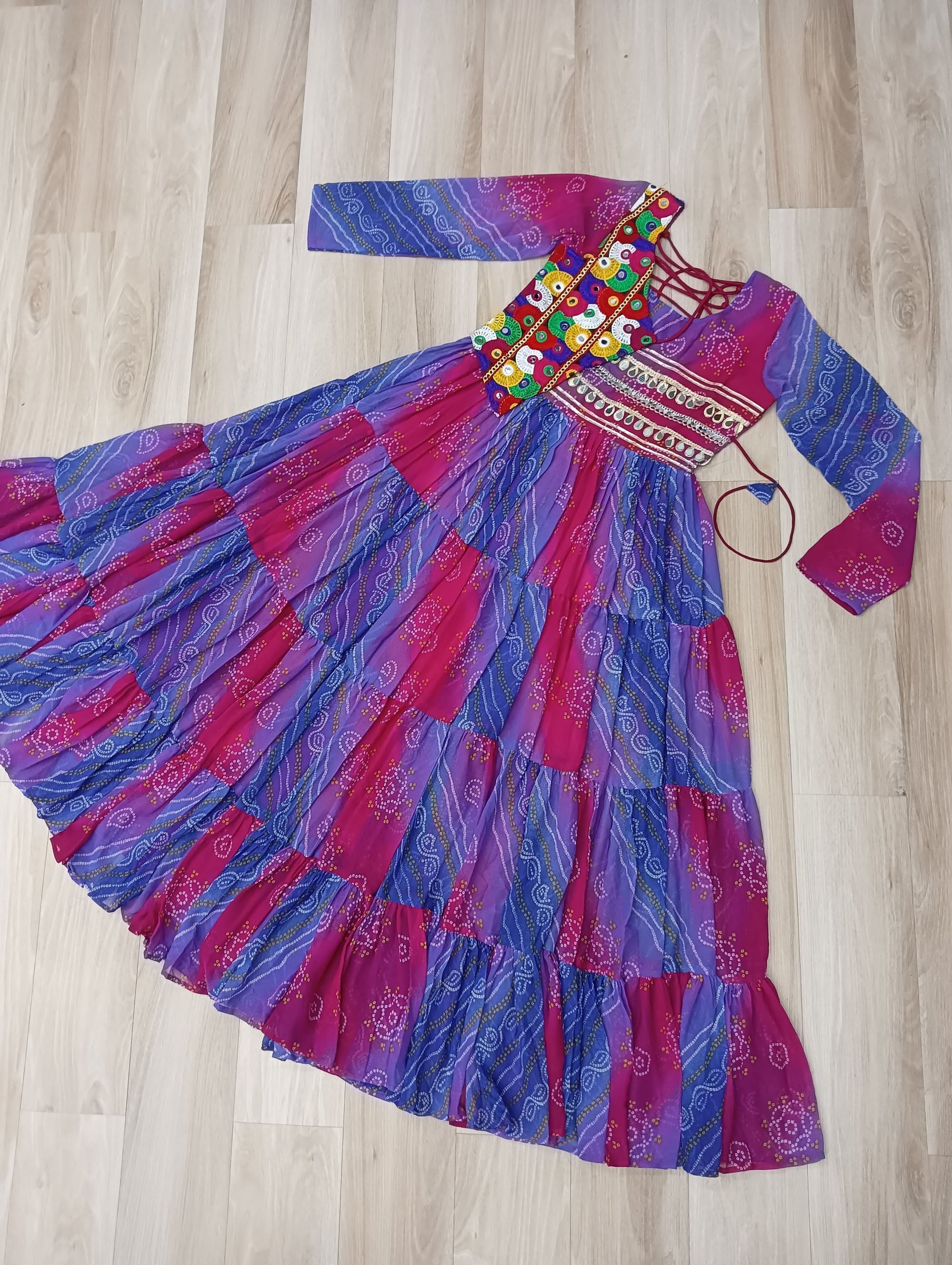 Lorenvalley Fashion Multicolor Faux Georgette Laheriya & Bandhej Print with kutchi patche work Gown