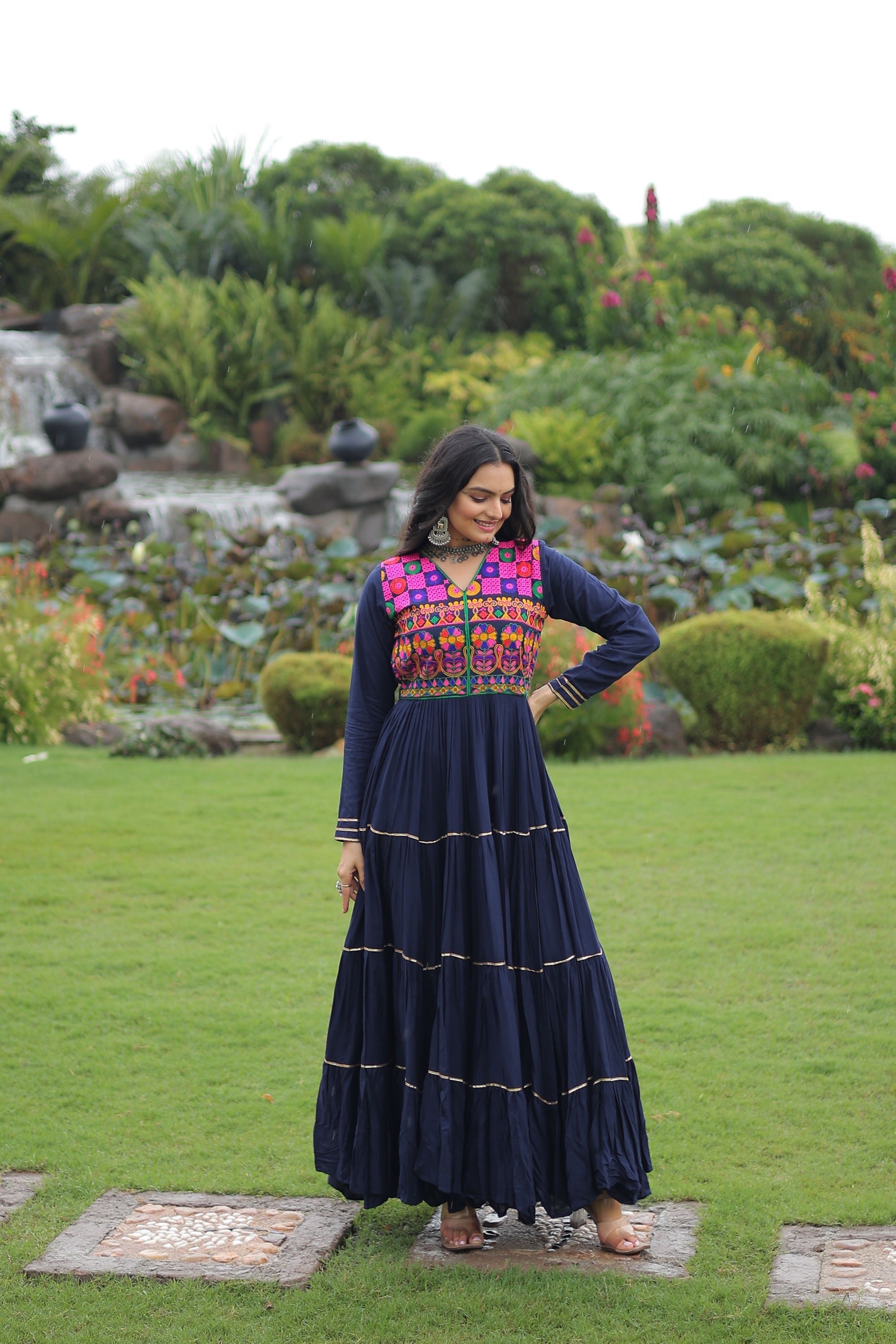Lorenvalley Fashion Navyblue Rayon Kutchi Gamthi Embroidered & Mirror hand Work Gown
