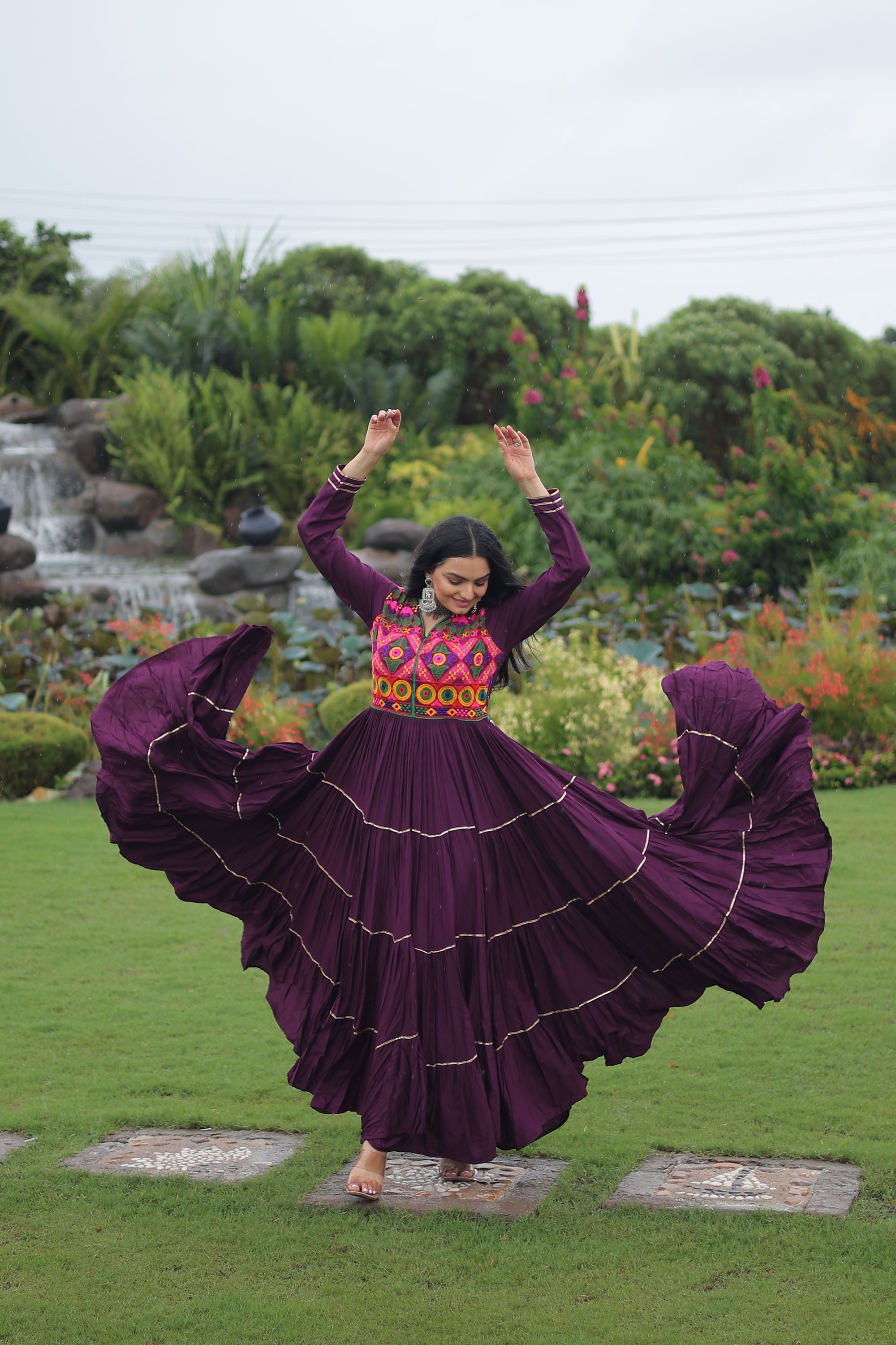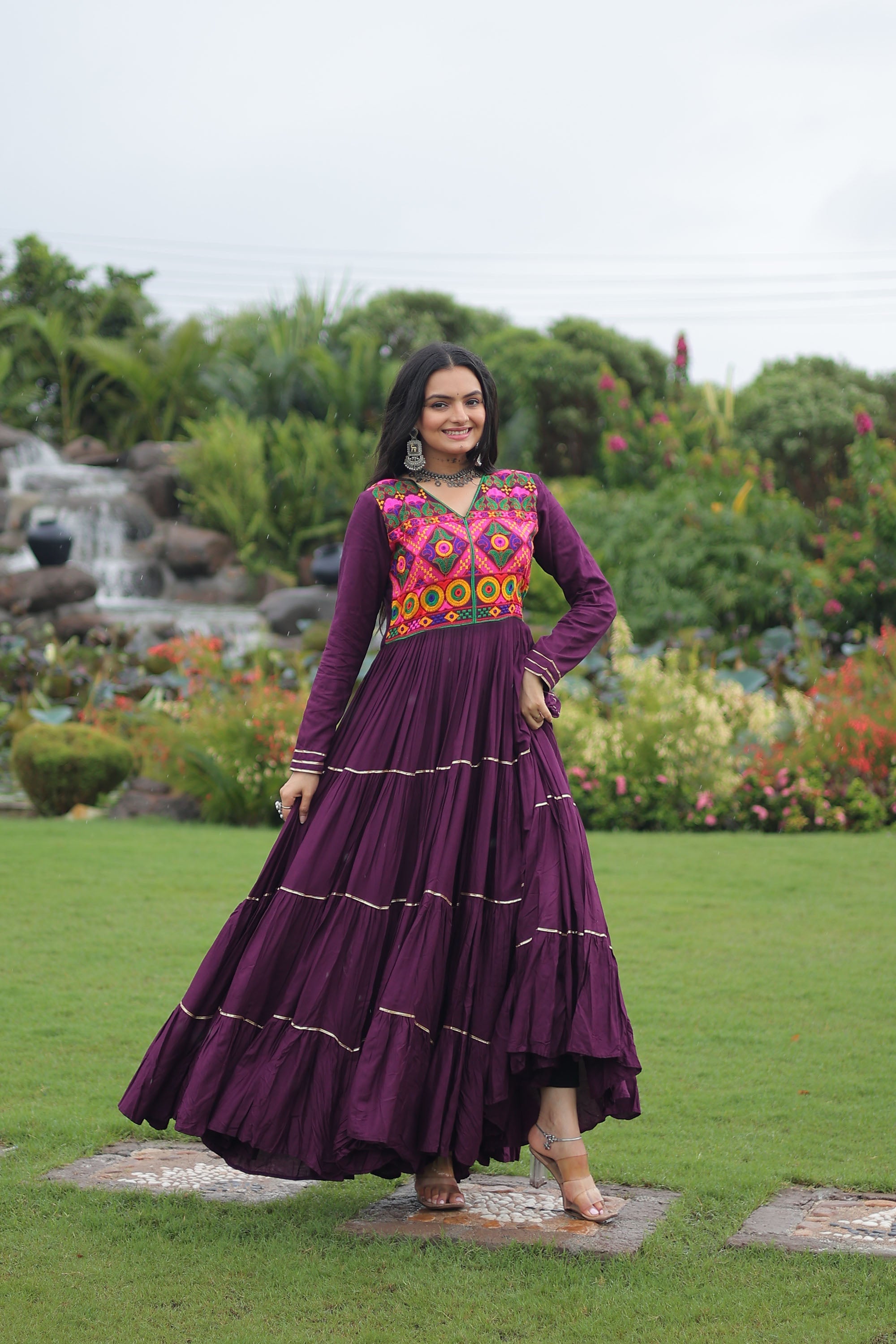 Lorenvalley Fashion Wine Rayon Kutchi Gamthi Embroidered & Mirror hand Work Gown