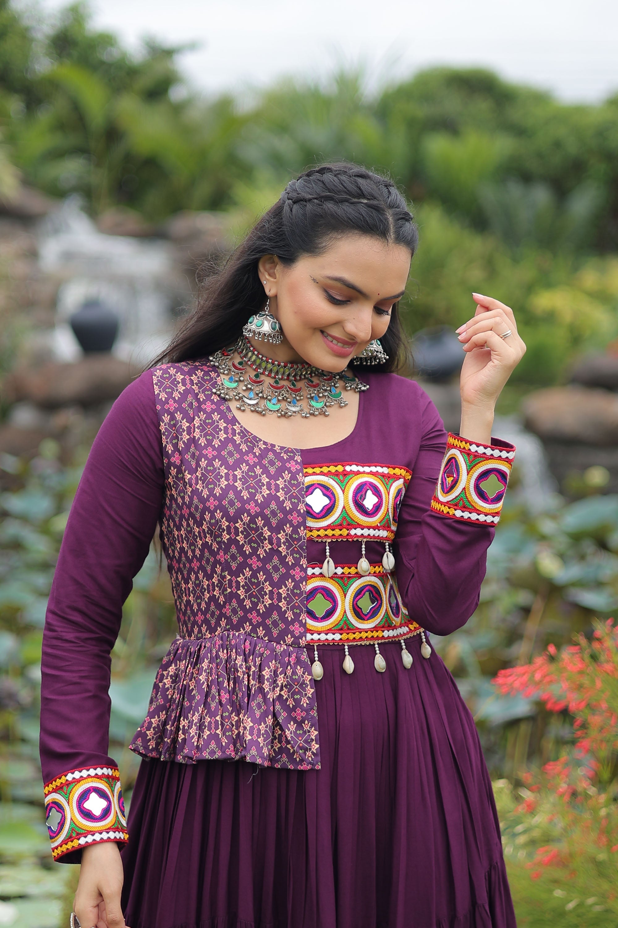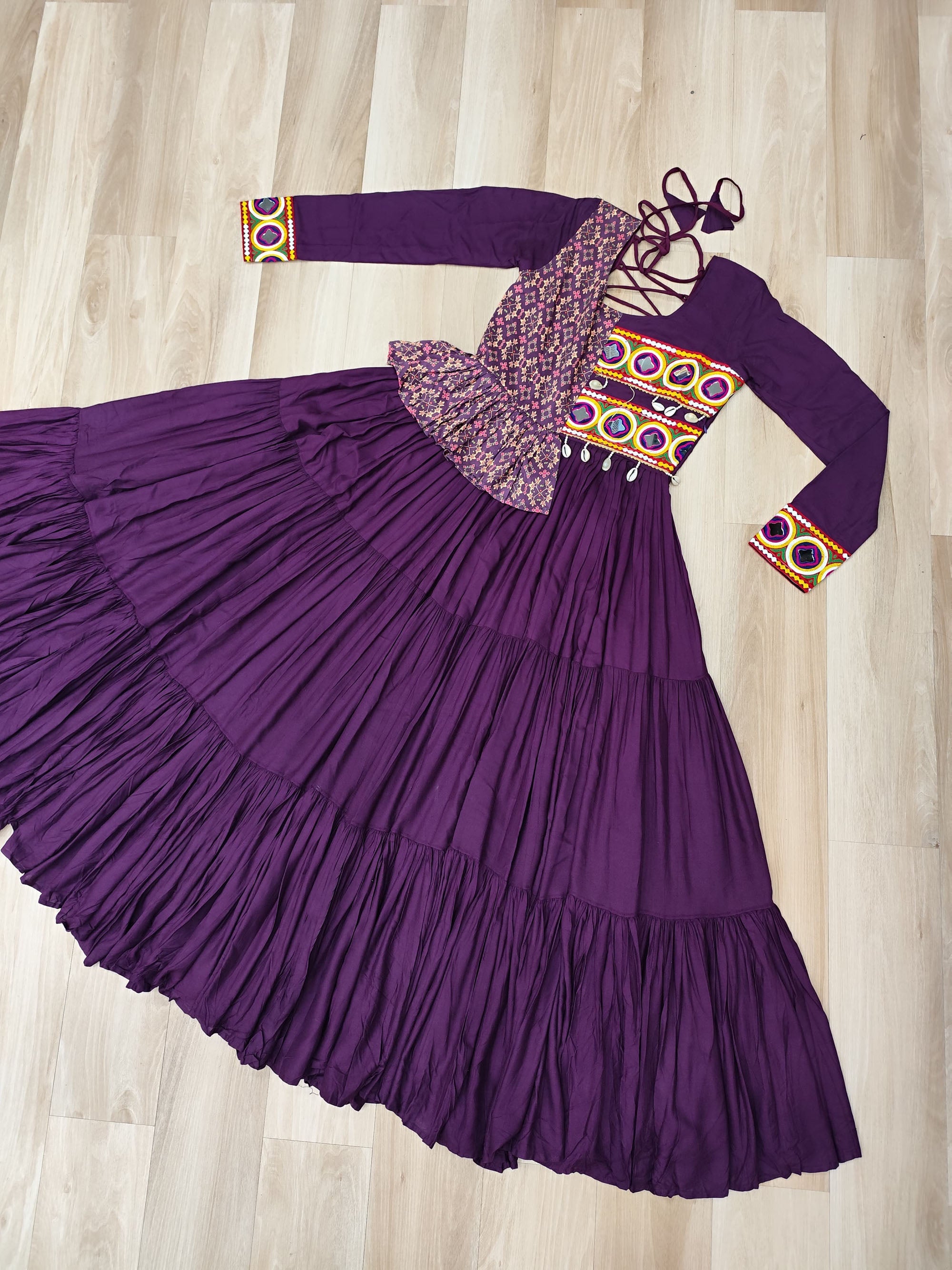 Lorenvalley Fashion Wine Rayon Kutchi Gamthi Embroidered Work & Cotton Print Work Gown