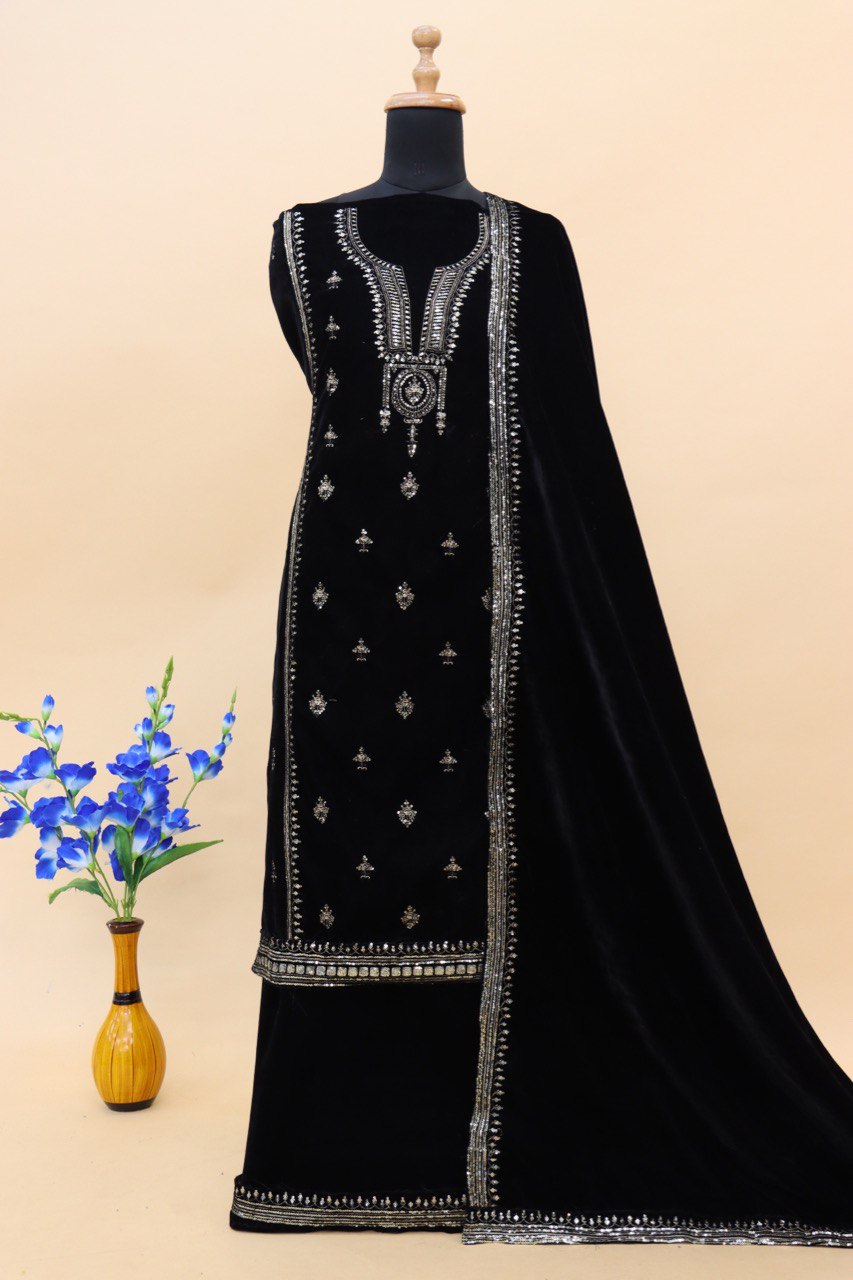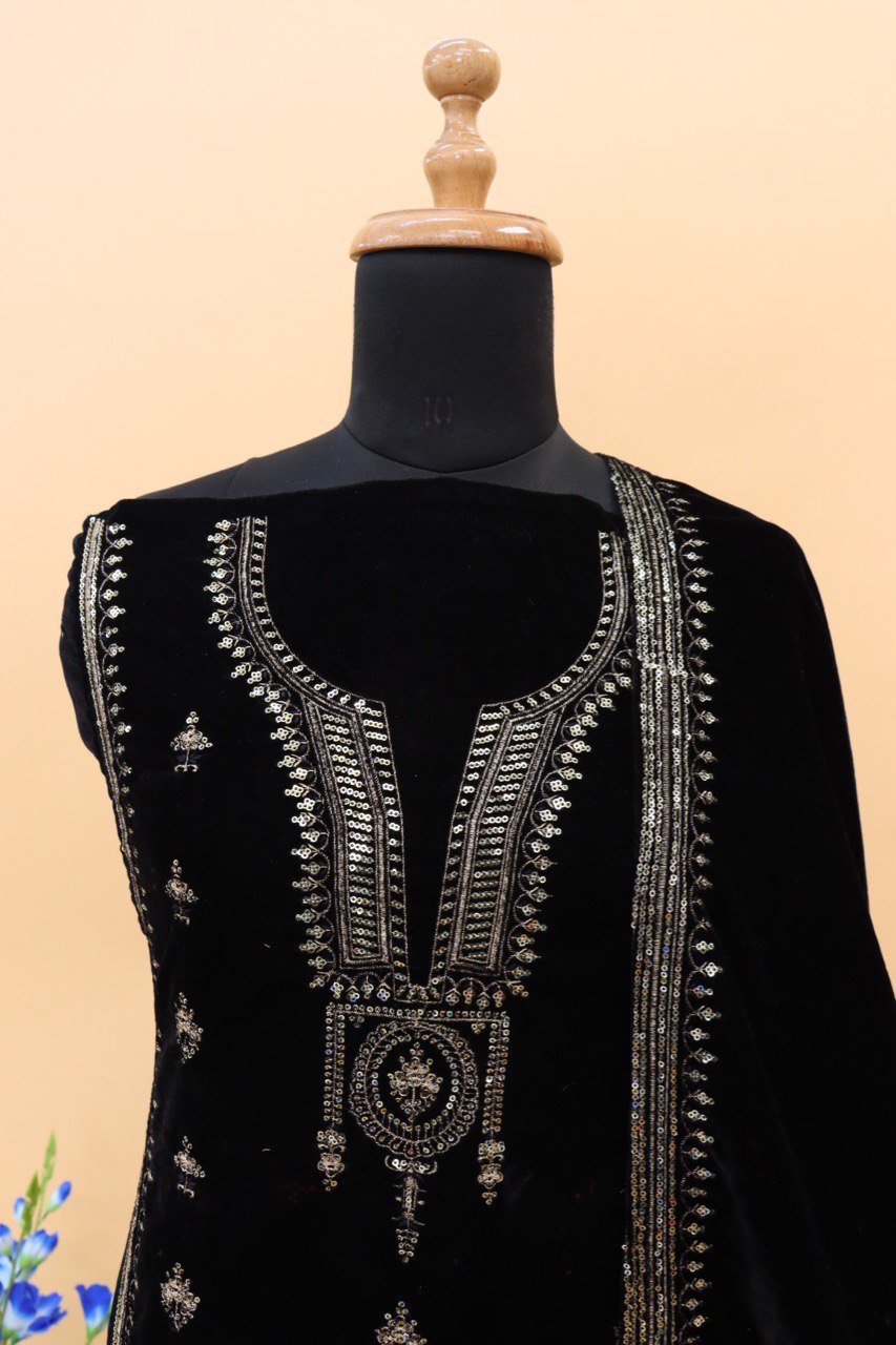 Lorenvalley Fashion Women Black Velvet Embroidered Salwar Suit Material