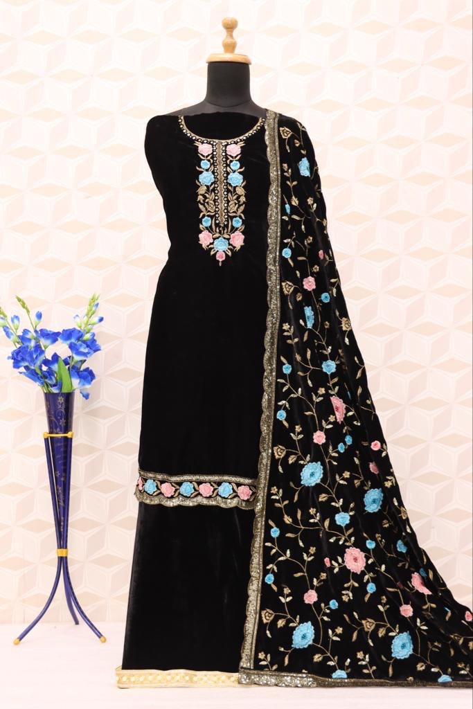 Lorenvalley Fashion Women Black Velvet Embroidered Salwar Suit Material