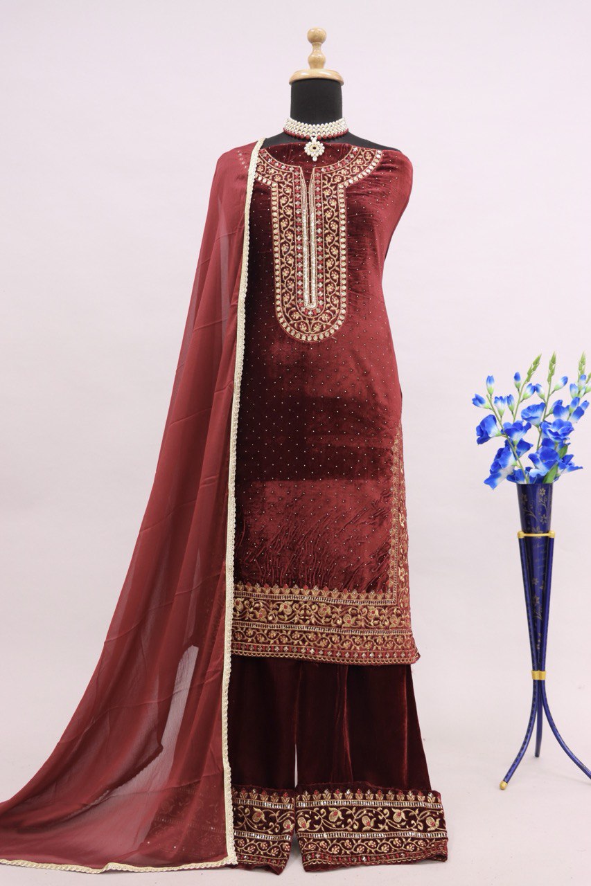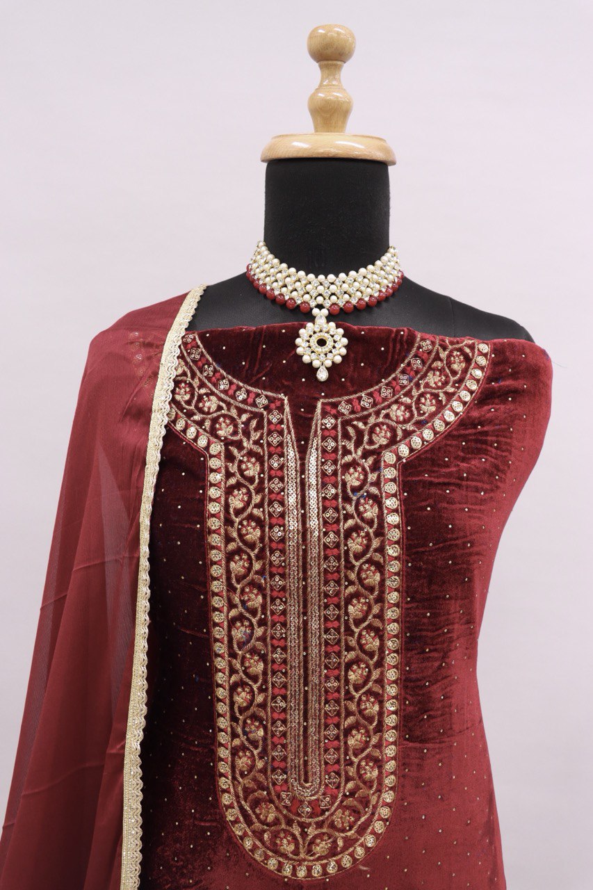 Lorenvalley Fashion Women Maroon Velvet Embroidered Salwar Suit Material