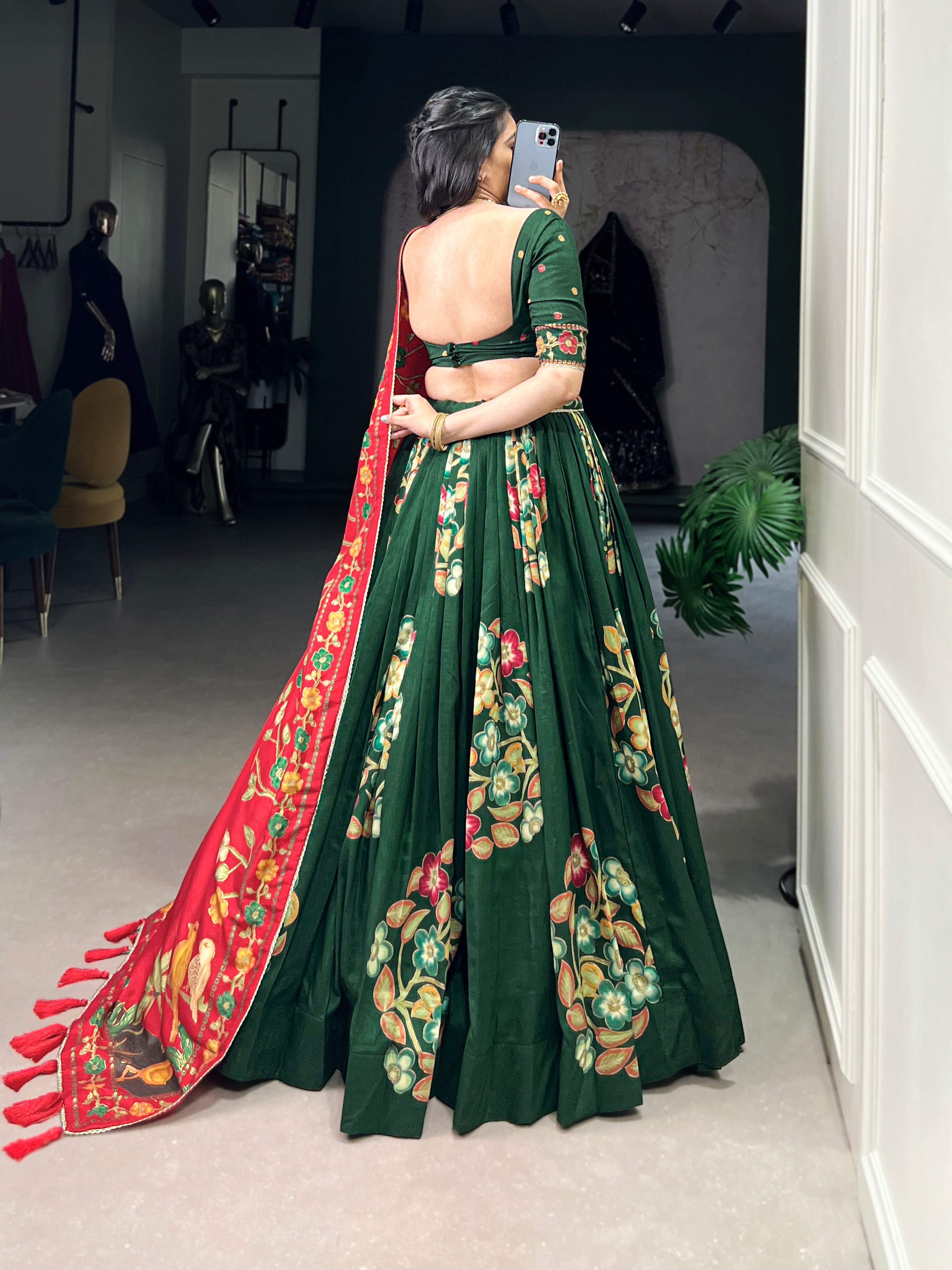 Lorenvalley Green Tussar Silk Printed And Foil Work With Lace Touch Up Lehenga Choli with Dupatta