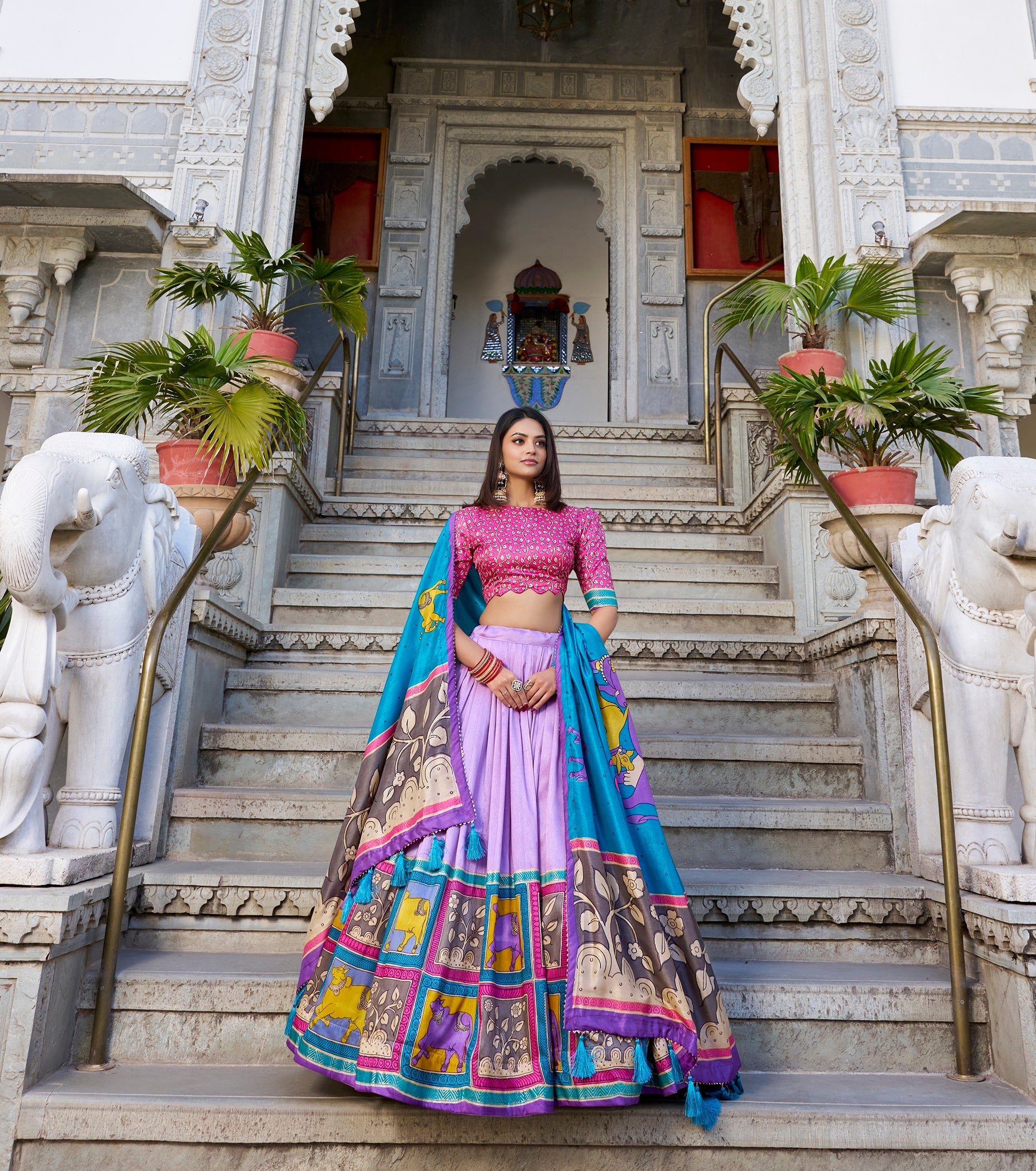 Lorenvalley Lavender Tussar Silk Kalamkari With Foil Work Lehenga Choli with Dupatta