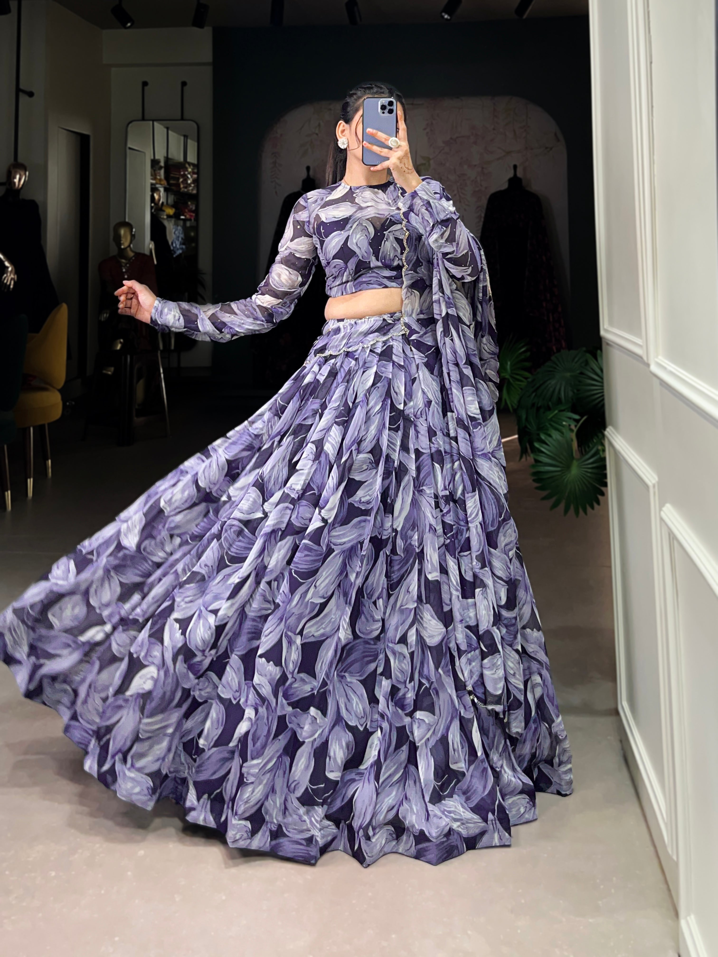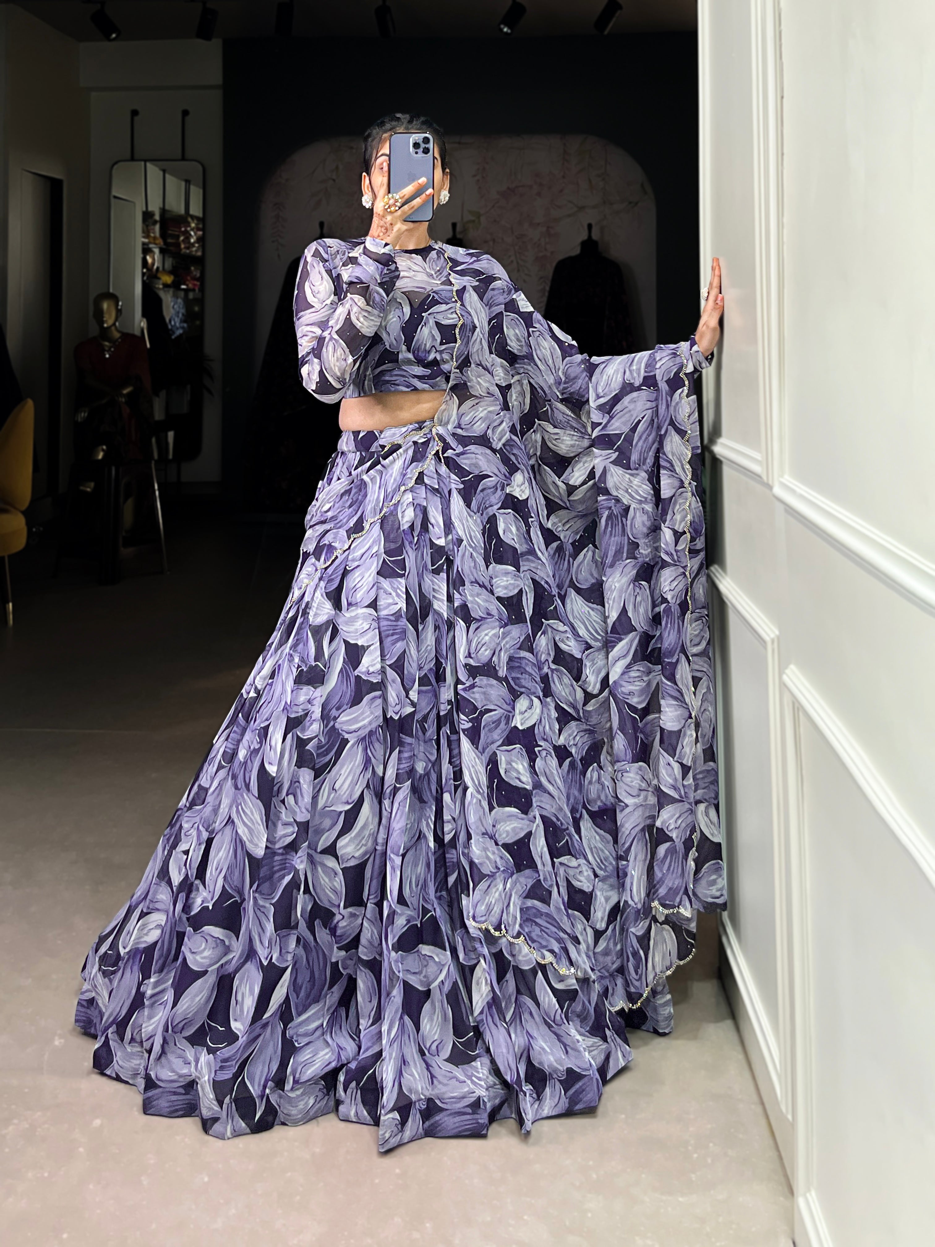 Lorenvalley Navy Blue Floral Print With Lace Touch Up Lehenga Choli with Dupatta