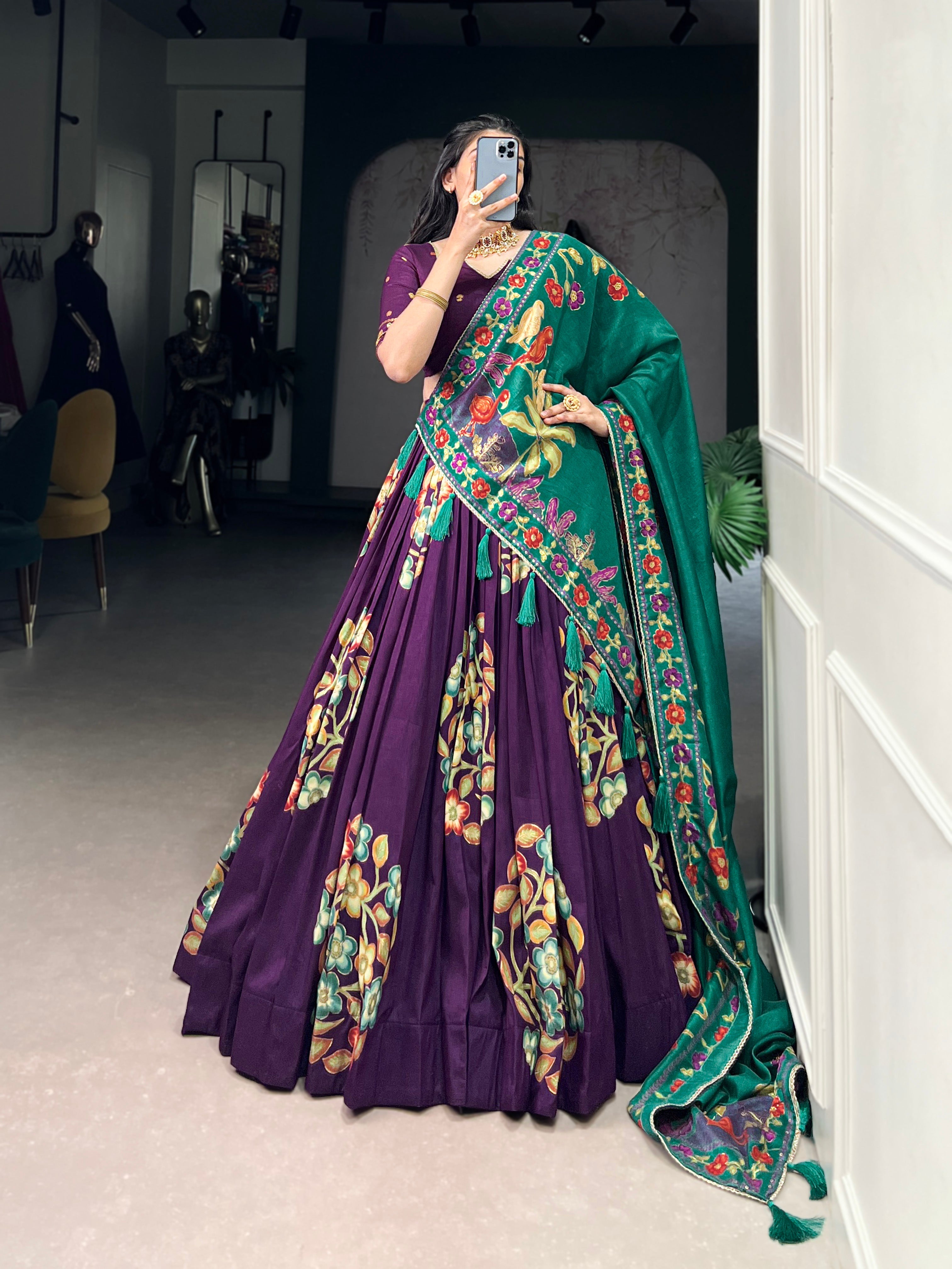 Lorenvalley Purple Tussar Silk Printed And Foil Work With Lace Touch Up Lehenga Choli with Dupatta