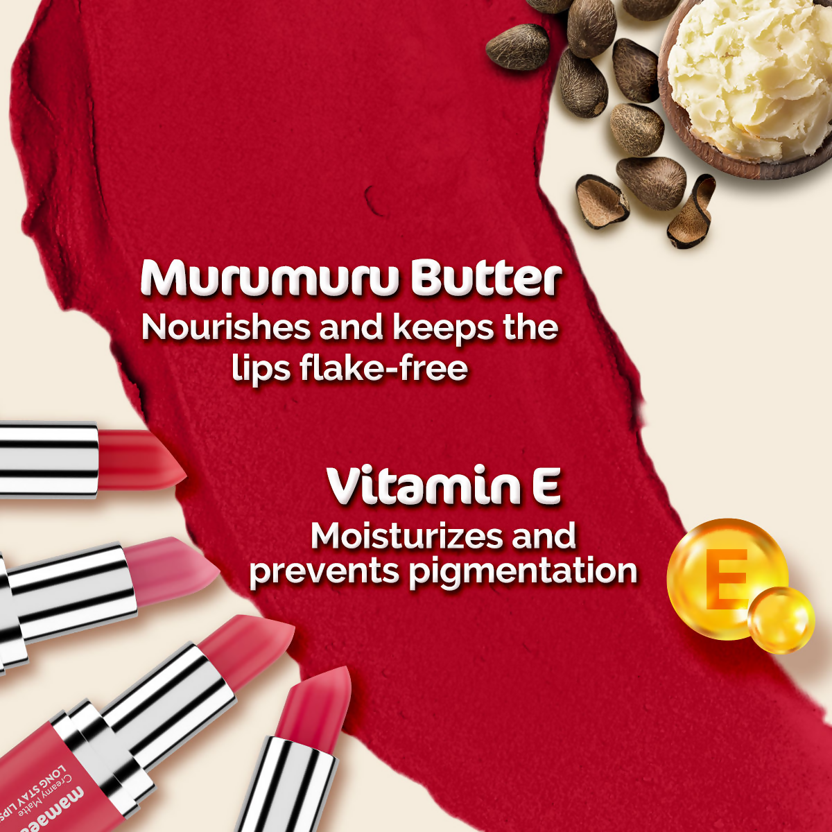 Get ready to pout out loud. Introducing India’s 1st Made Safe Certified Creamy Matte Long Stay Lipstick with an 8-hour non-drying matte finish that just refuses to quit. With 9 creamy matte shades curated for all Indian skin tones, our Creamy Matte Long Stay Lipstick provides an intense color payoff in just one glide. Infused with the natural goodness of Murumuru Butter and Vitamin E, this lipstick keeps your pout moisturized and oh-so-hydrated while still giving it that matte effect. Murumuru Butter will keep your lips moisturized for up to 8 hours. And then there’s Vitamin E, which is packed with antioxidants that help prevent pigmentation.