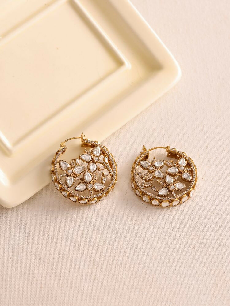 Elevate your elegance with these stunning circular earrings, adorned with sparkling moissanite diamonds. Crafted in a timeless round silhouette, each piece features an intricate flower-shaped design nestled within the circle, symbolizing grace and femininity. The brilliant moissanite stones catch the light from every angle, offering the fire and brilliance of diamonds with a sustainable edge. Lightweight yet luxurious, these earrings are perfect for both daytime charm and evening glam.Styling Tip: Pair these floral moissanite earrings with a sleek bun or soft waves to highlight their shape. They complement both ethnic wear and contemporary outfits effortlessly.