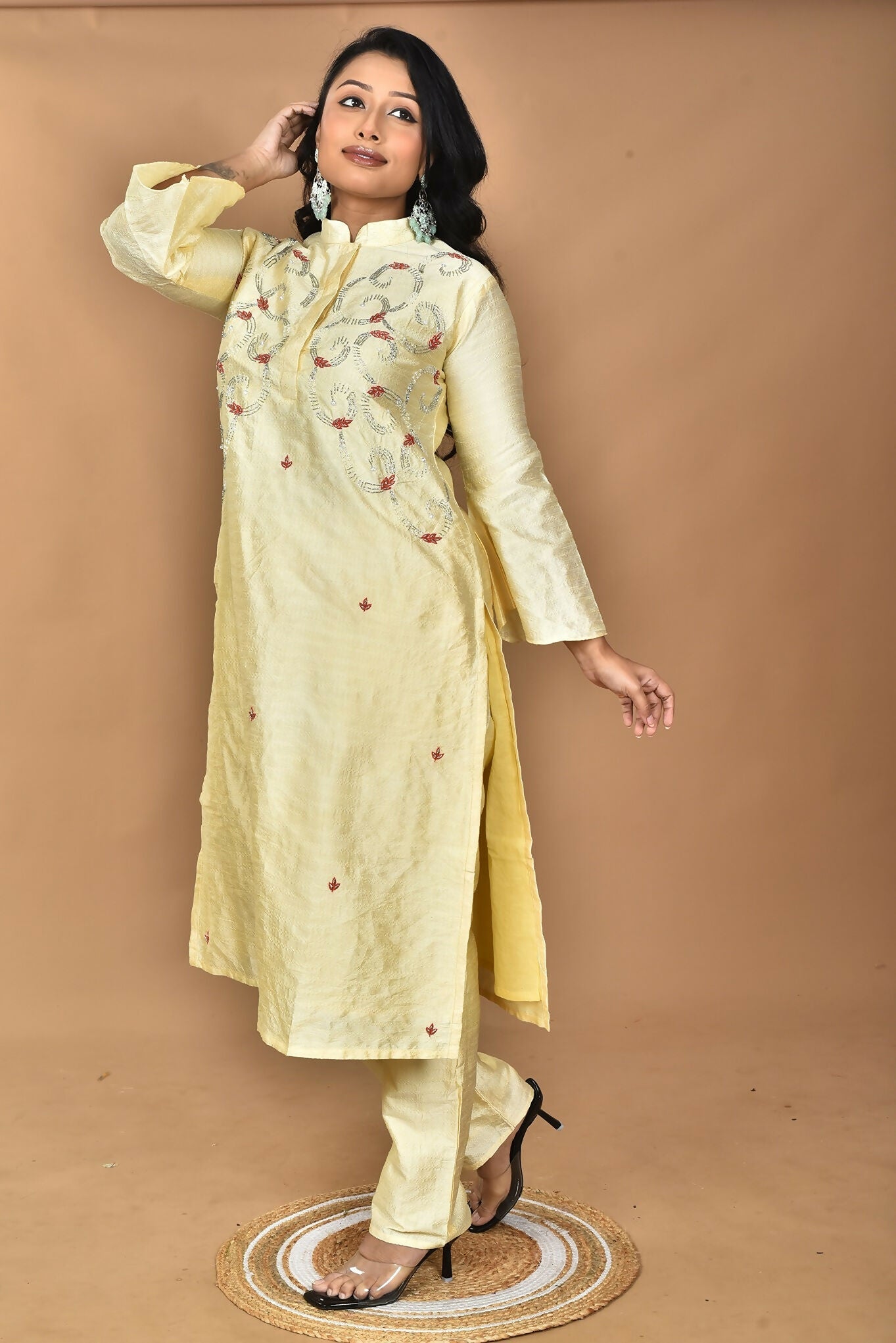 Morchari Women And Hand Embroidery Co-Ord Set-Lemon- Yellow