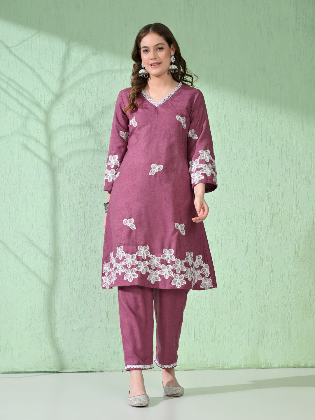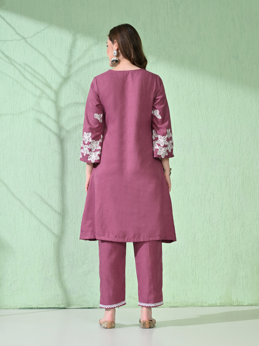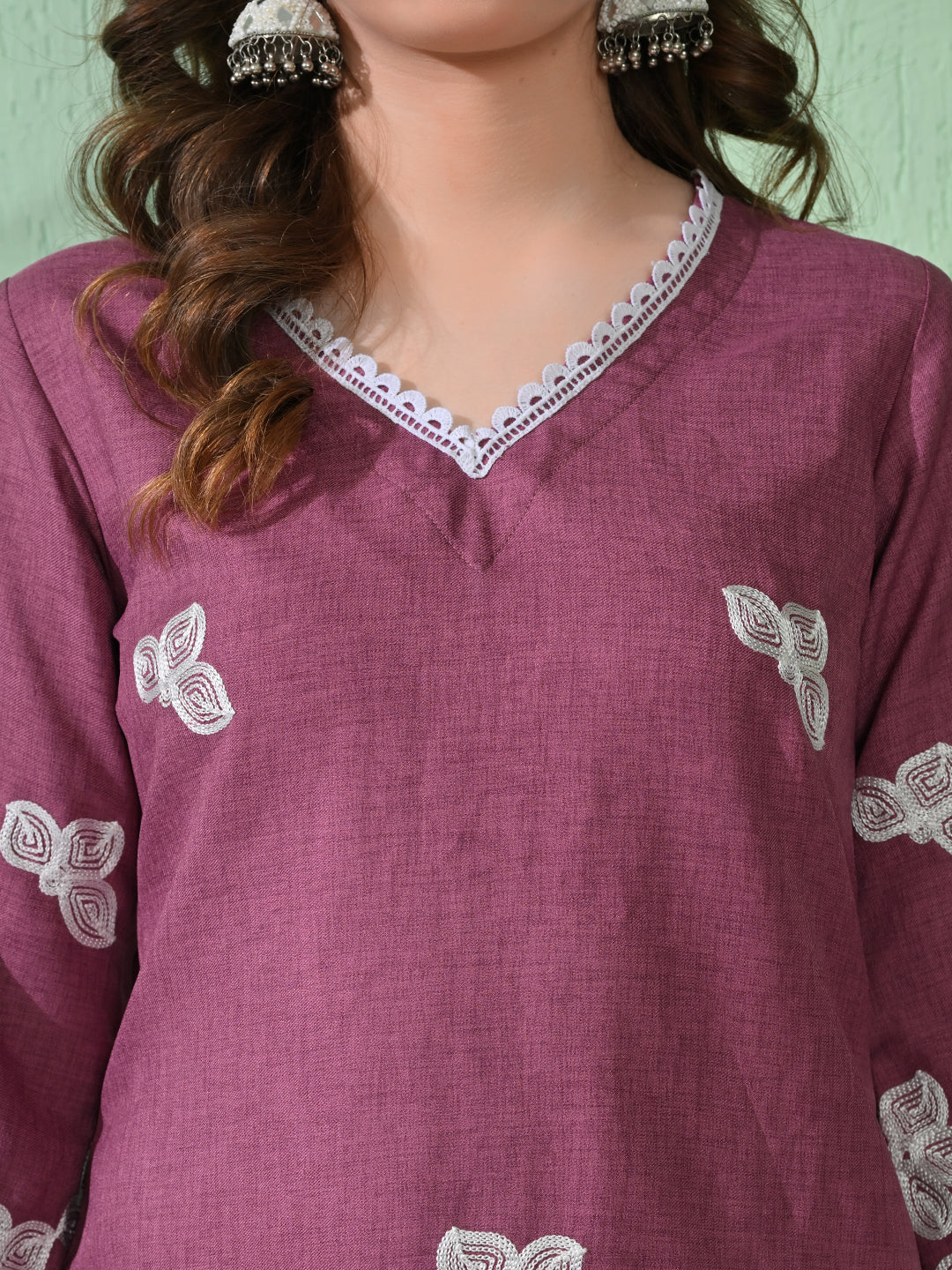 Myshka Women's Embroidered Calf Length Mauve Kurta With Palazzo