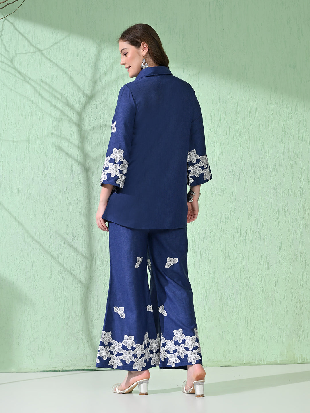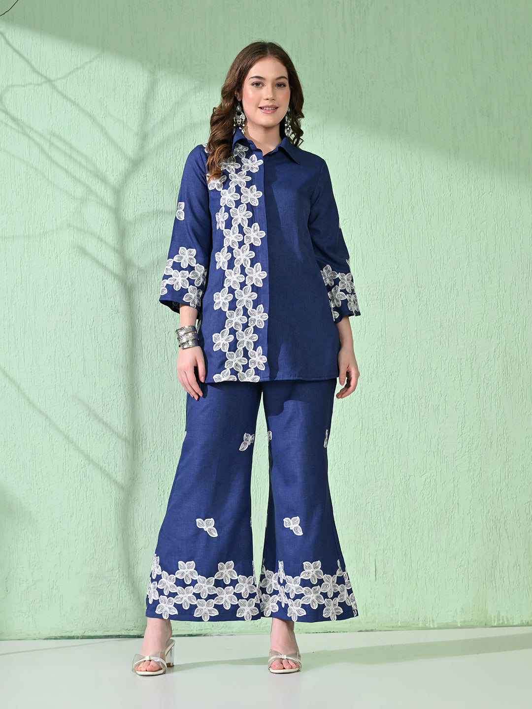 Myshka Women's Floral Embroidered Navy Tunic with Trouser